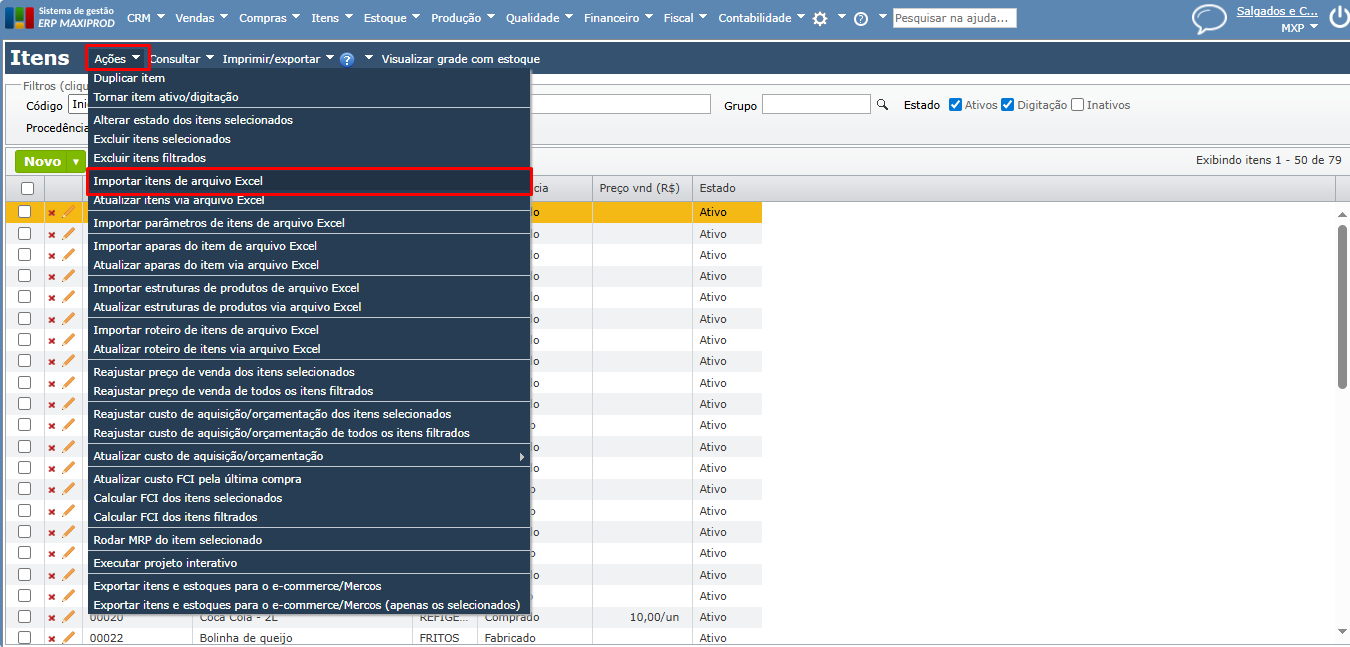 2) Selecione a opção “Ações > Importar itens de arquivo Excel”.
