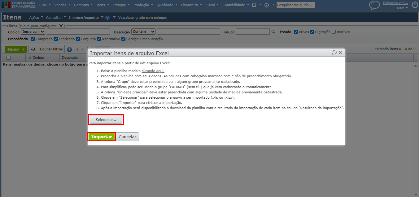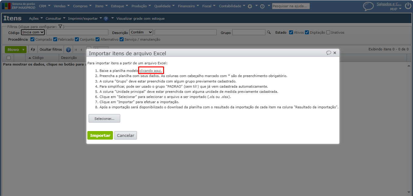 Importante: para mais orientações e detalhes sobre a importação de itens por planilha Excel, clique aqui.