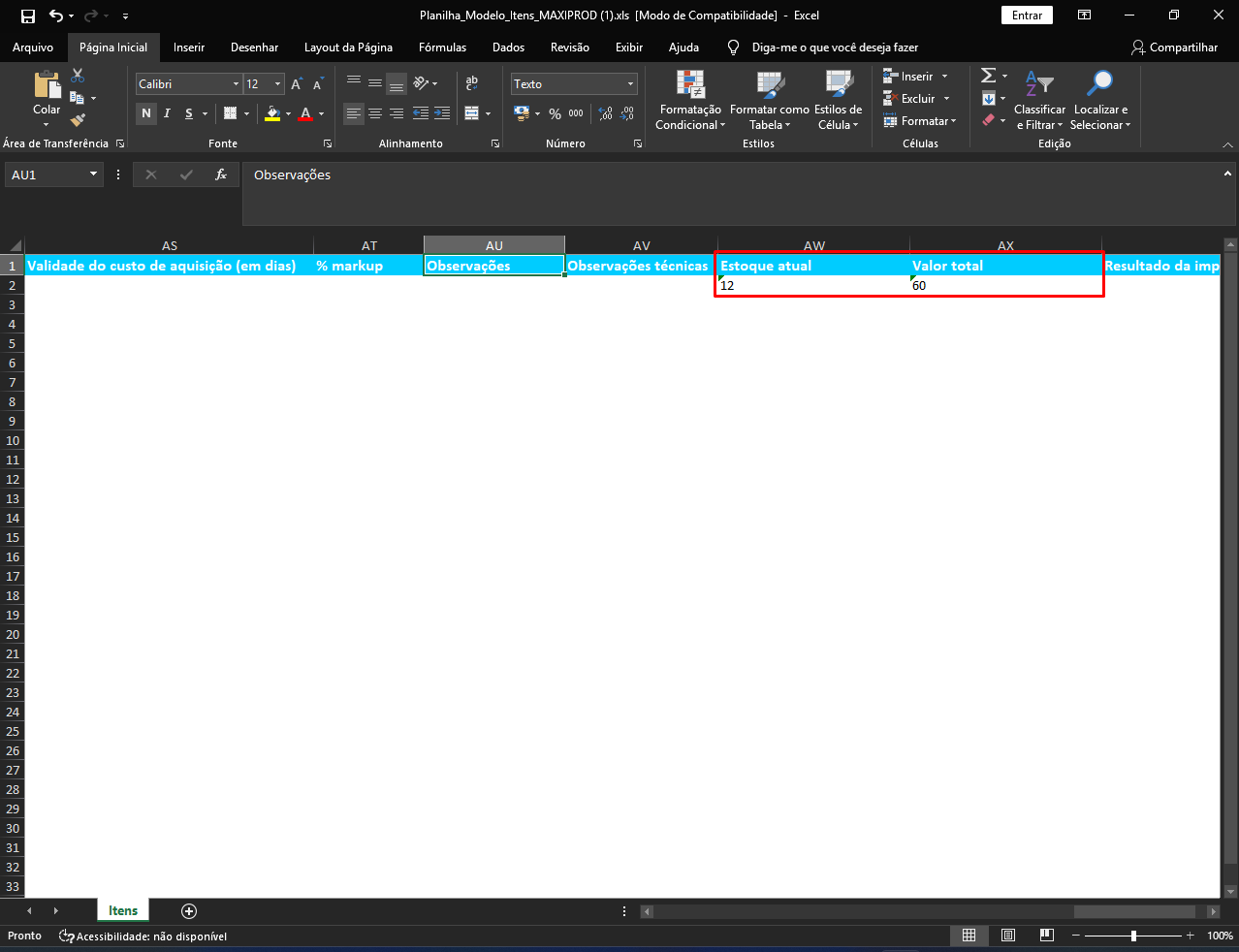 4) Na coluna “Estoque atual”, informe a quantidade do estoque inicial e, na coluna “Valor total”, seu custo total.