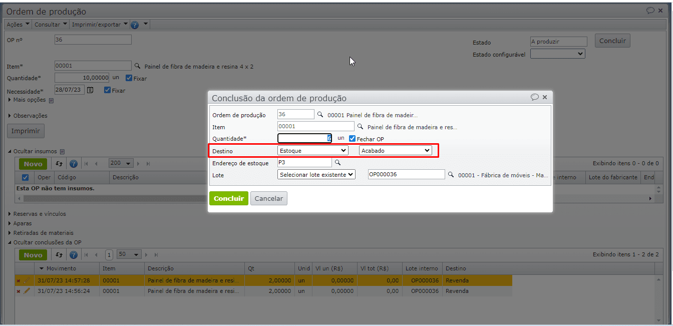 • Conta de destino ao concluir uma ordem de produção