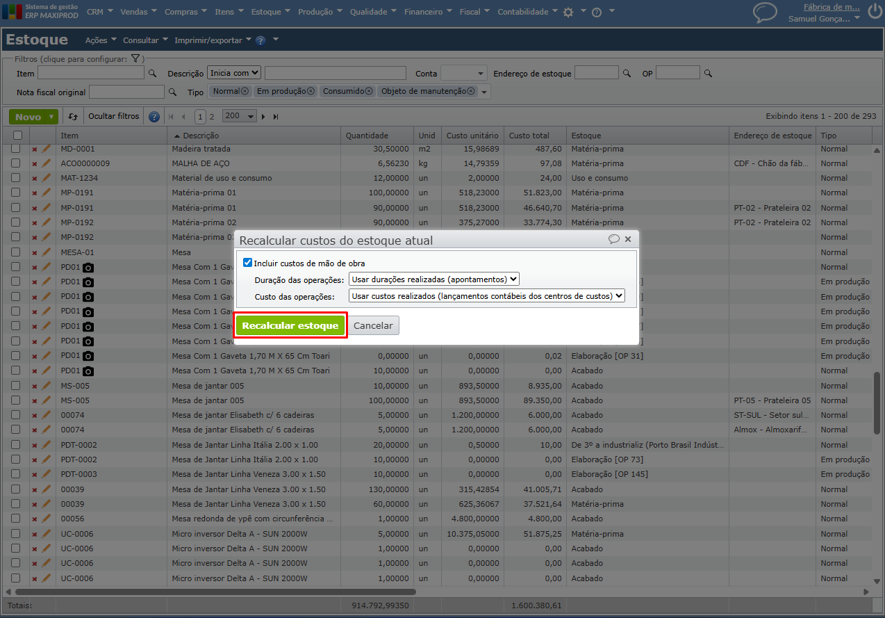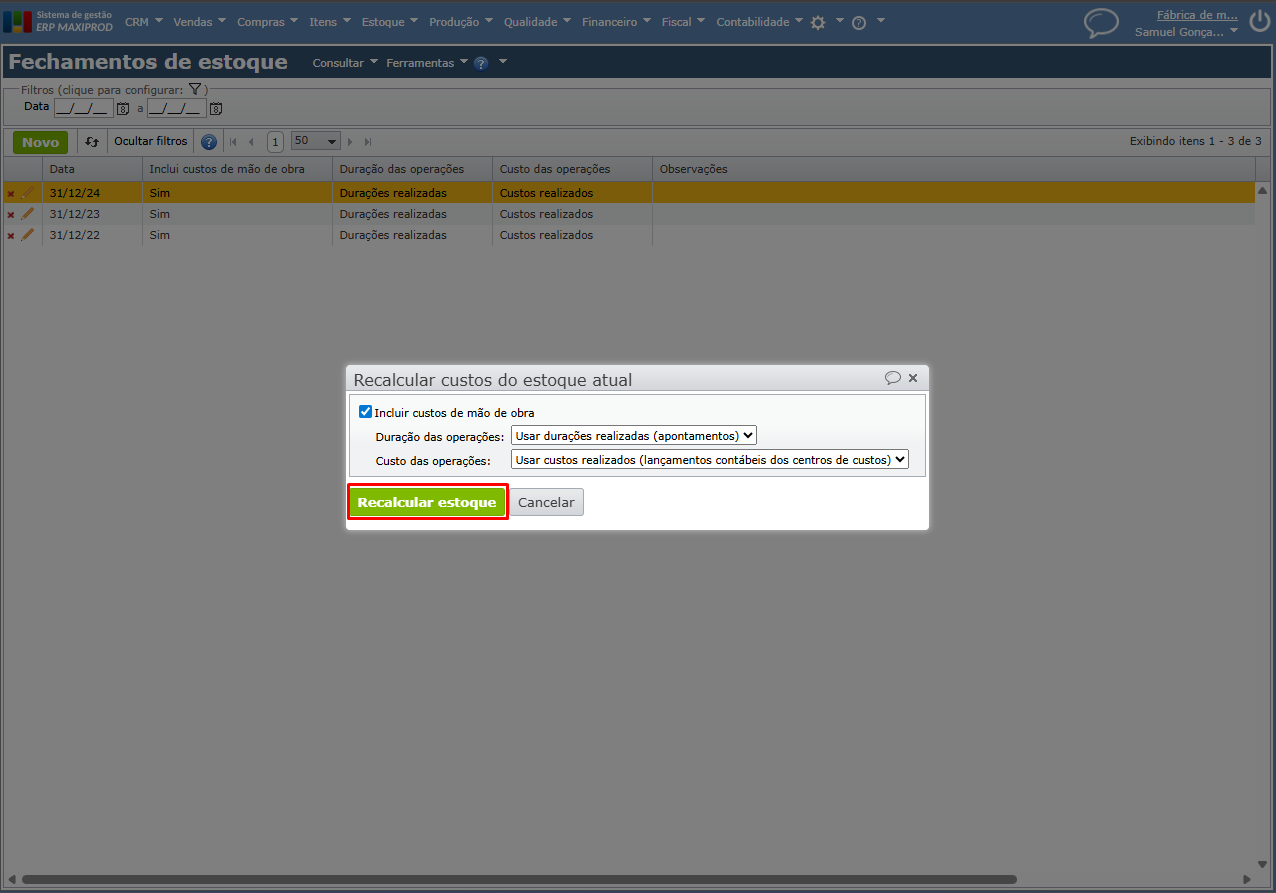 Para entender melhor cada uma destas opções, clique aqui. Ao definir se os custos de mão de obra serão incluídos e, caso afirmativo, as opções a serem consideradas, clique no botão verde “Recalcular estoque”.