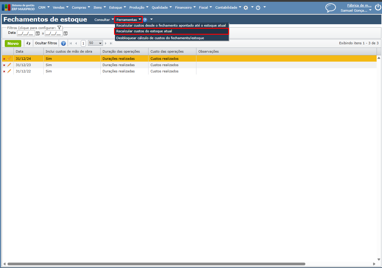 2) Na tela de fechamentos de estoque, acesse “Ferramentas > Recalcular custos do estoque atual”.