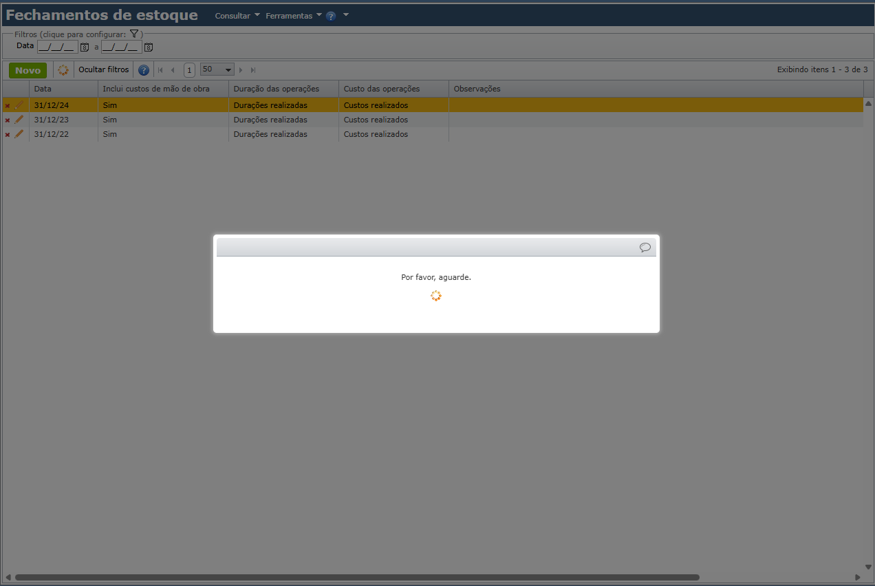 - Lançamentos retroativos, como notas fiscais registradas com datas anteriores, baixas de insumos após quantidade concluída em ordens de produção, etc.
