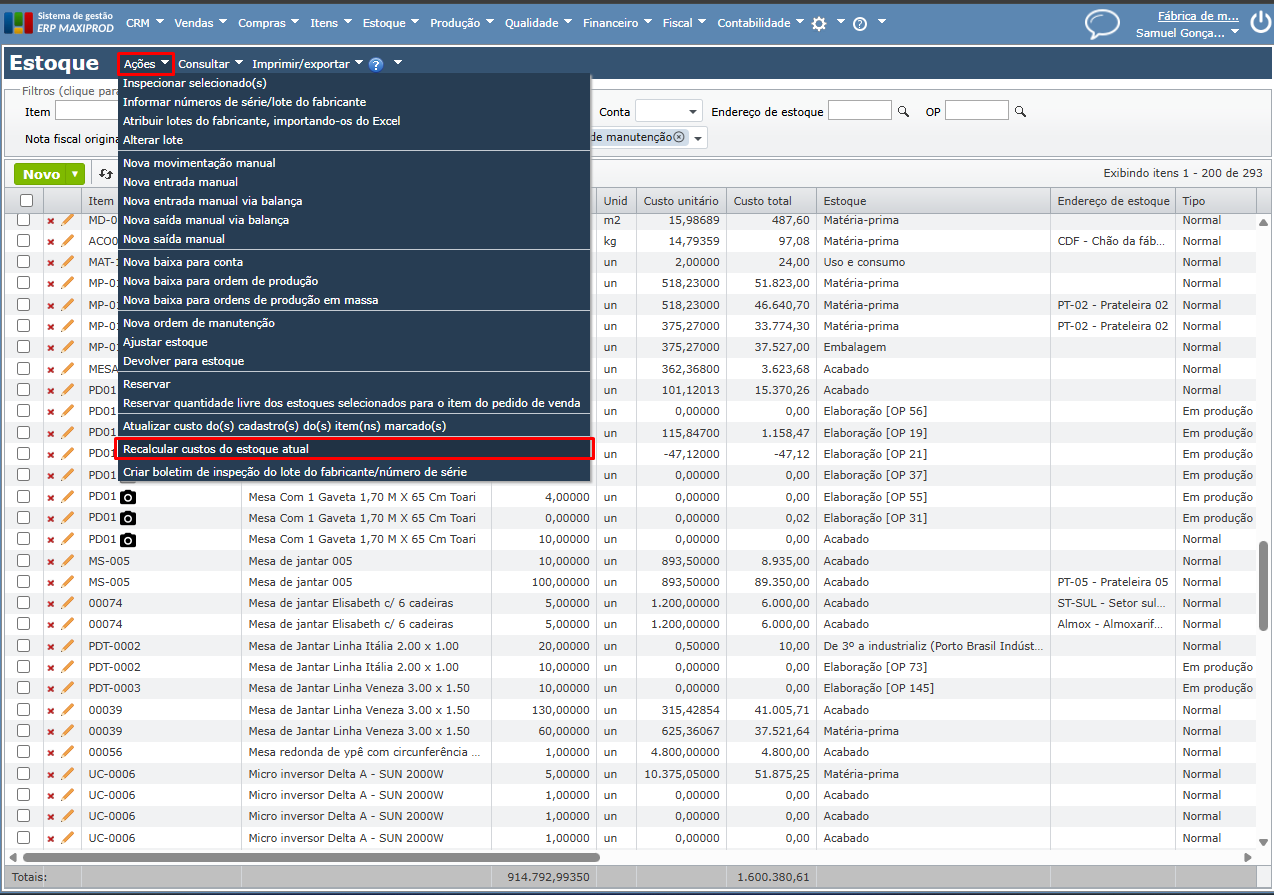 1) Na grade de estoque, acesse o submenu “Ações > Recalcular custos do estoque atual”.