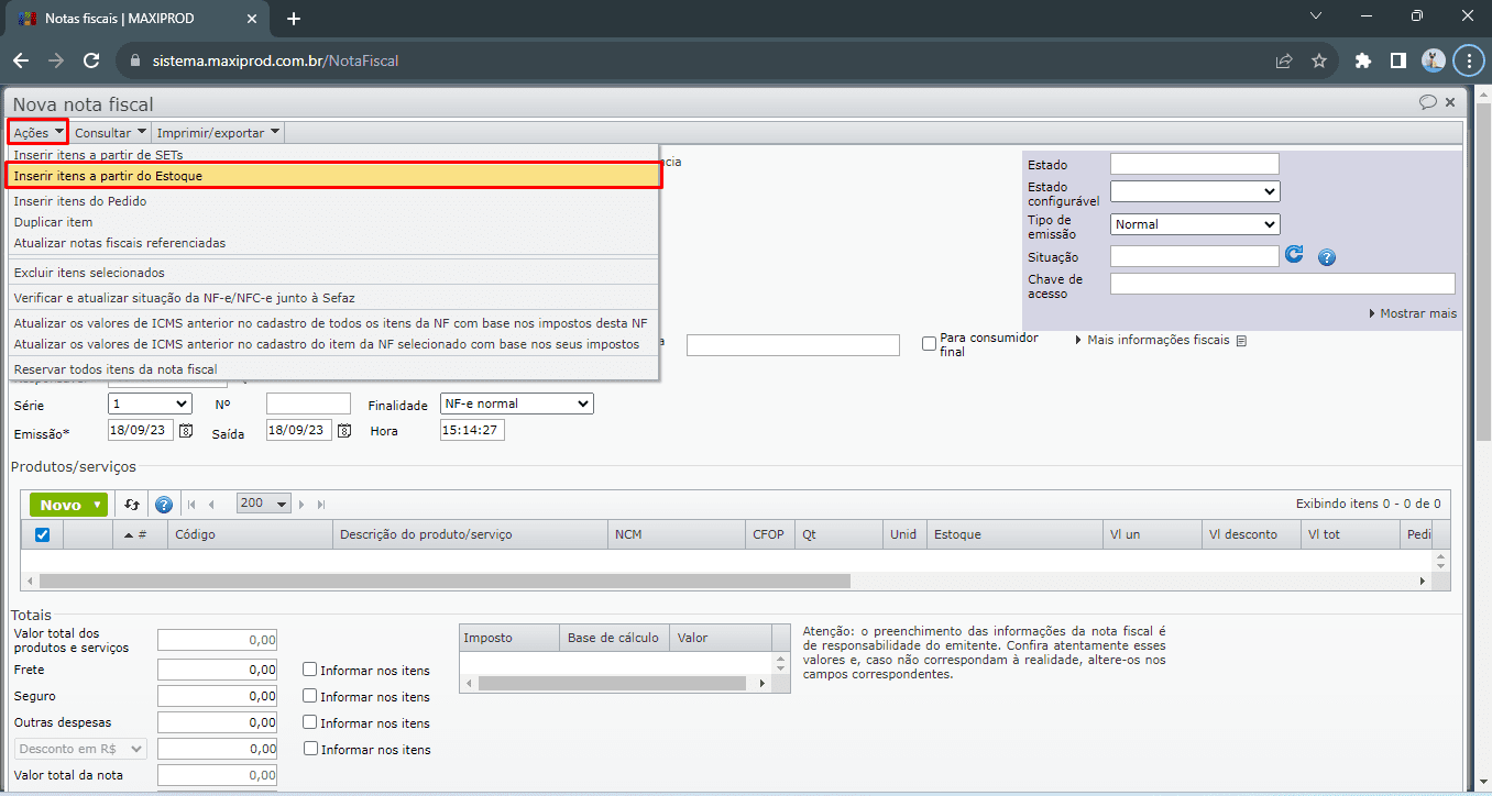 9) Informe na nota fiscal os itens e seus respectivos estoques, que serão transferidos para a outra unidade da empresa. Para selecionar os itens diretamente no estoque, o usuário deve utilizar o menu “Ações” > “Inserir itens a partir do estoque”.