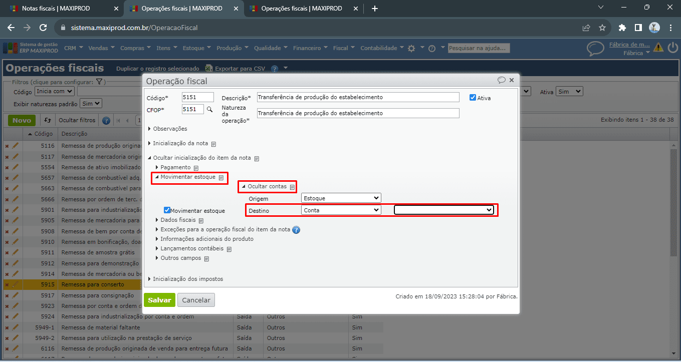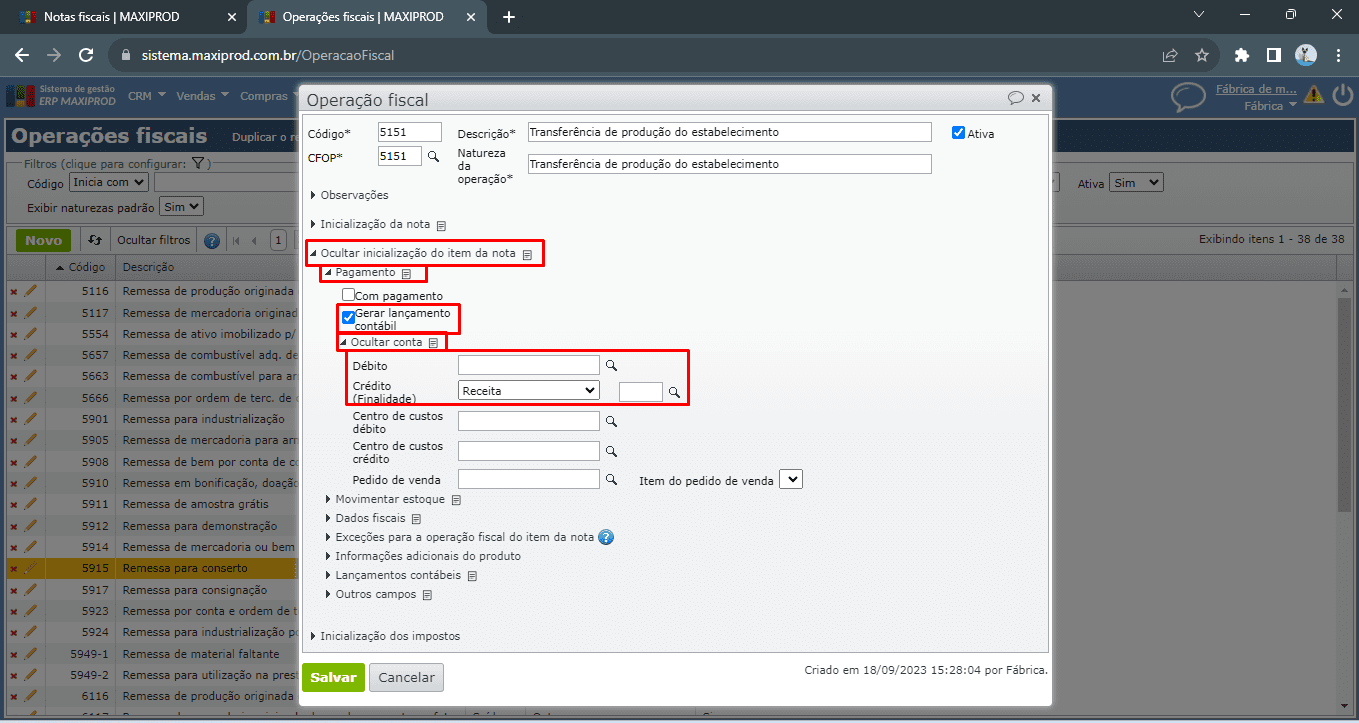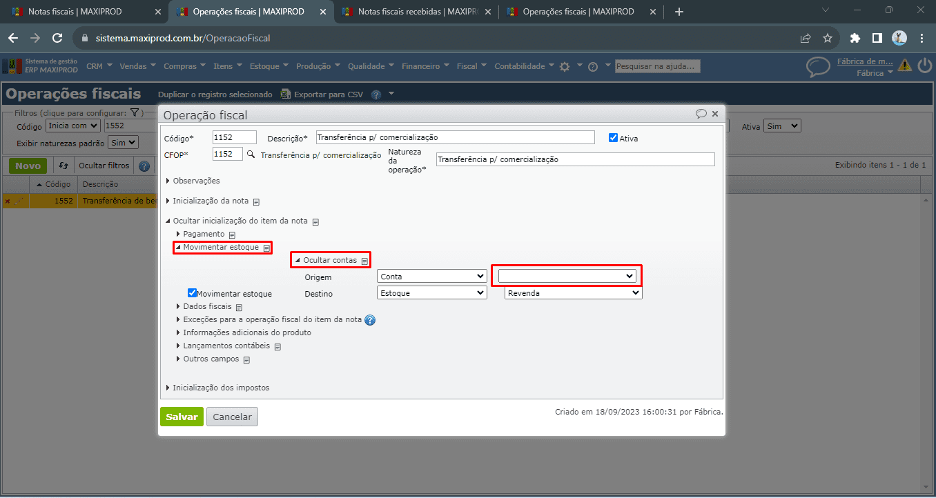 4) Caso a operação fiscal indicada não esteja cadastrada no ERP MAXIPROD, acesse “Fiscal > Cadastros > Operações fiscais” e duplique a operação fiscal que mais se aproxima da operação fiscal indicada. Após duplicar, altere o código, CFOP e demais campos necessários da nova operação fiscal. Para saber mais sobre operações fiscais, clique aqui.