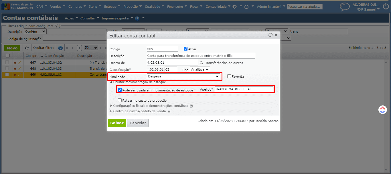 • Na transferência de estoque entre Matriz e Filial, geralmente, é criada uma conta contábil na finalidade “Despesa” e marcada que “Pode ser usada em movimentação de estoque”. Porém, recomendamos sempre verificar cuidadosamente qual a correta configuração da conta a ser utilizada como destino da movimentação de estoque, como, por exemplo, finalidade e natureza. Lembrando ser necessário marcar que pode ser usada em movimentação de estoque, bem como definir um “Apelido”.