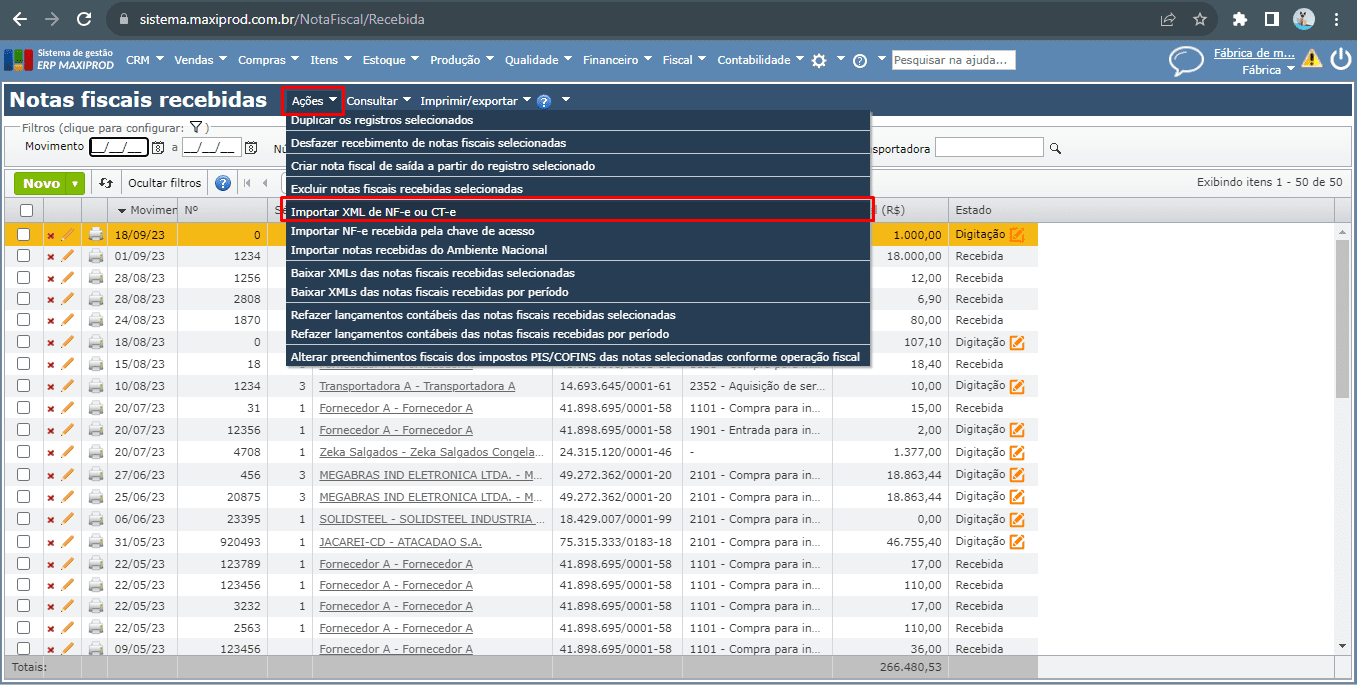 12) Logado na empresa que receberá o estoque, acesse “Compras” > “Notas recebidas”, acesse o submenu “Ações” e opção “Importar XML de NF-e ou CT-e” e faça a importação do XML da nota emitida anteriormente.