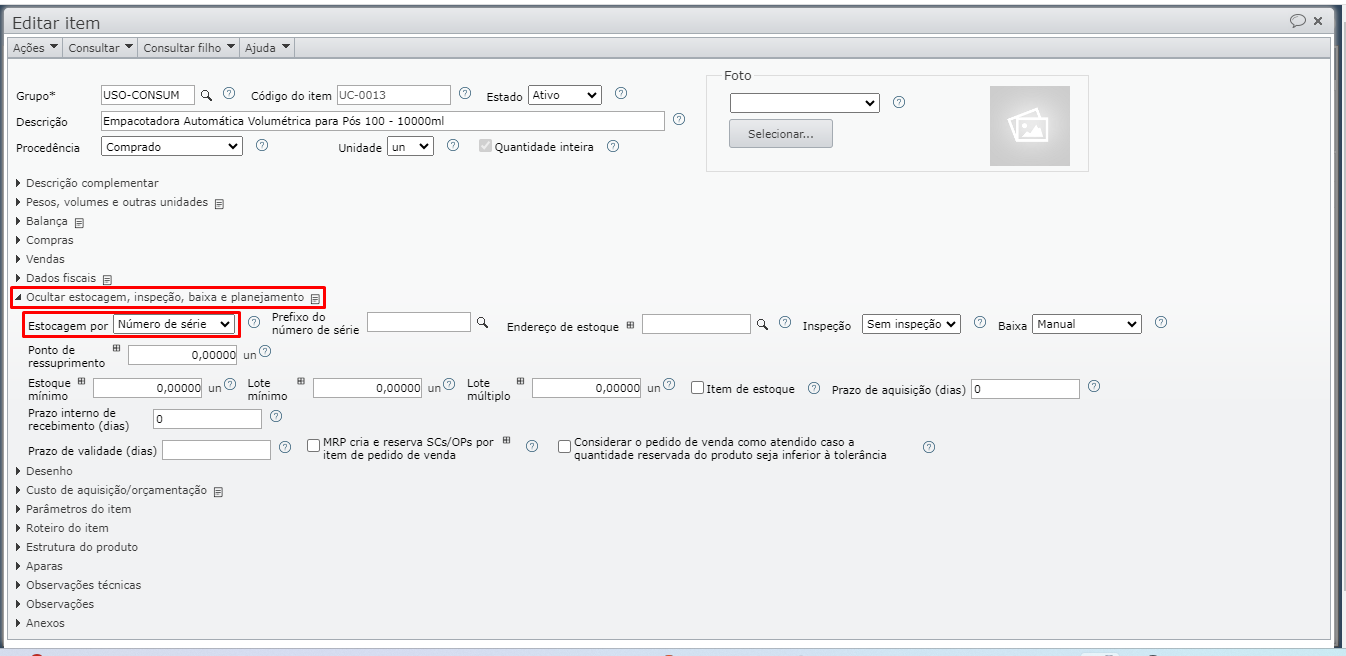 3) No cadastro do item, expanda a seção “Estocagem, inspeção, baixa e planejamento”, e preencha o campo “Estocagem por”, com a opção “Número de série”.
