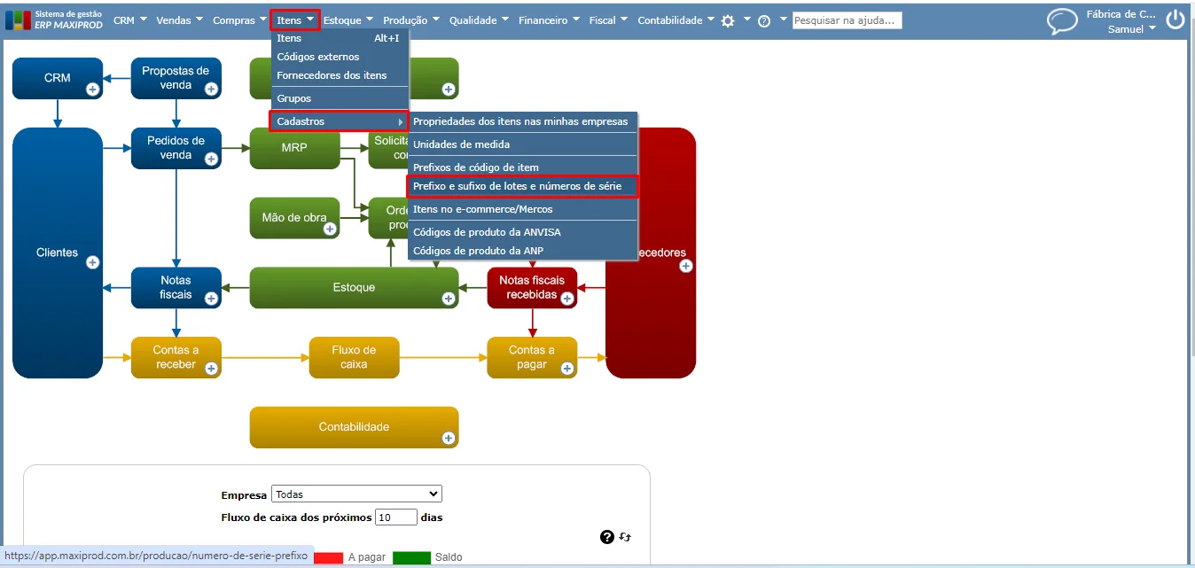 1) Acesse o menu superior “Itens > Cadastros > Prefixo e sufixo de lotes e números de série”.