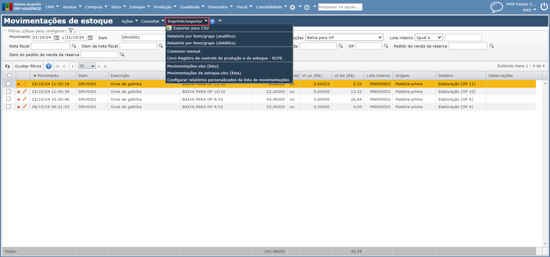 4) Após preencher os filtros, pode-se ver as matérias-primas consumidas por ordens de produção. Pelo menu “Imprimir/exportar”, os resultados podem ser exportados sob forma de relatório.
