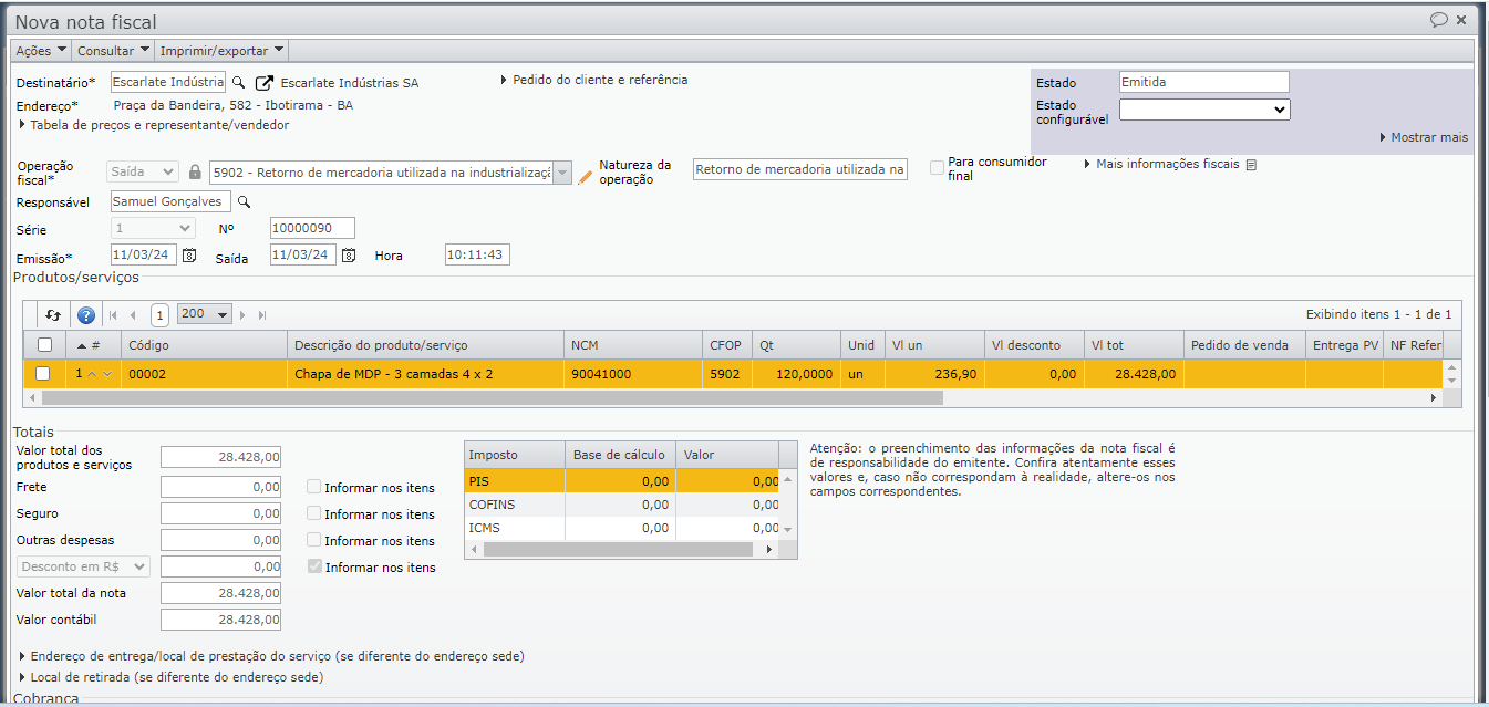 - Como incluir em uma nota fiscal os insumos de propriedade de terceiros, baixados para uma OP?