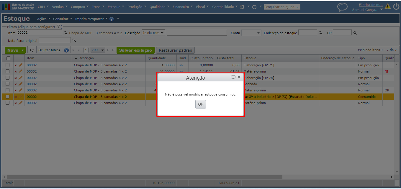 2) Os estoques do tipo “Consumido” não podem ser ajustados por meio de inventário. Como se trata de estoques que precisam ser retornados fiscalmente para o dono, o sistema limita as suas movimentações, visando manter a integridade.