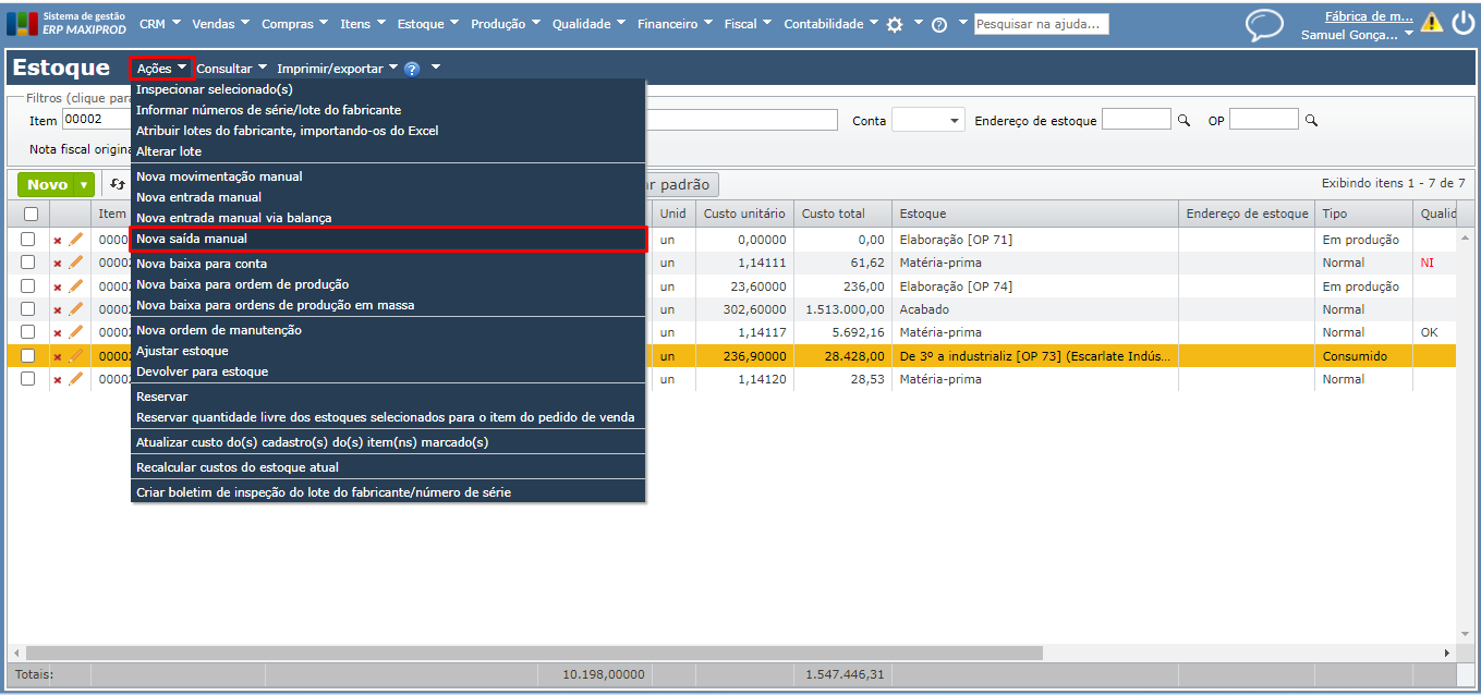c) emissão de NF de saída: mesmo que a NF original de retorno do material consumido tenha sido emitida por outro sistema, pode-se criar uma NF simbólica no ERP MAXIPROD e movimentar estes estoques, quando precisam ser ajustados.