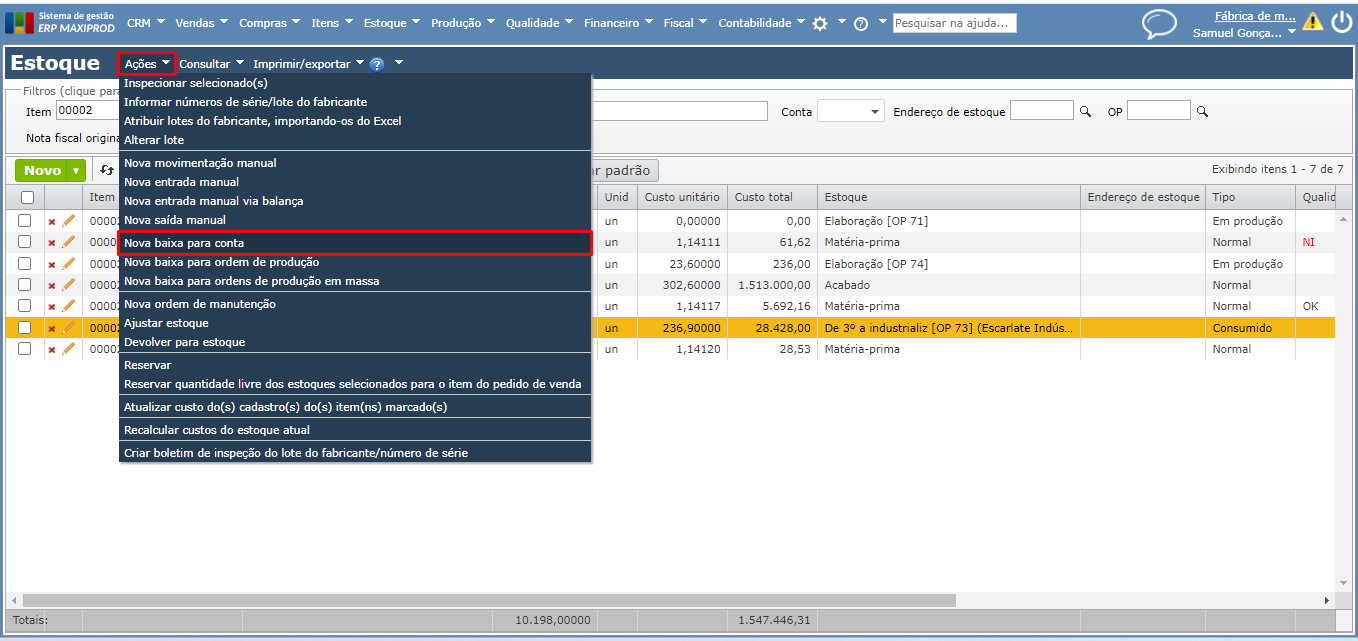 b) nova baixa para conta: na tela de estoque, menu “Ações > Nova baixa para conta” pode-se baixar estoque “Consumido” destinando seu custo a uma conta de despesa (um registro de cada vez).