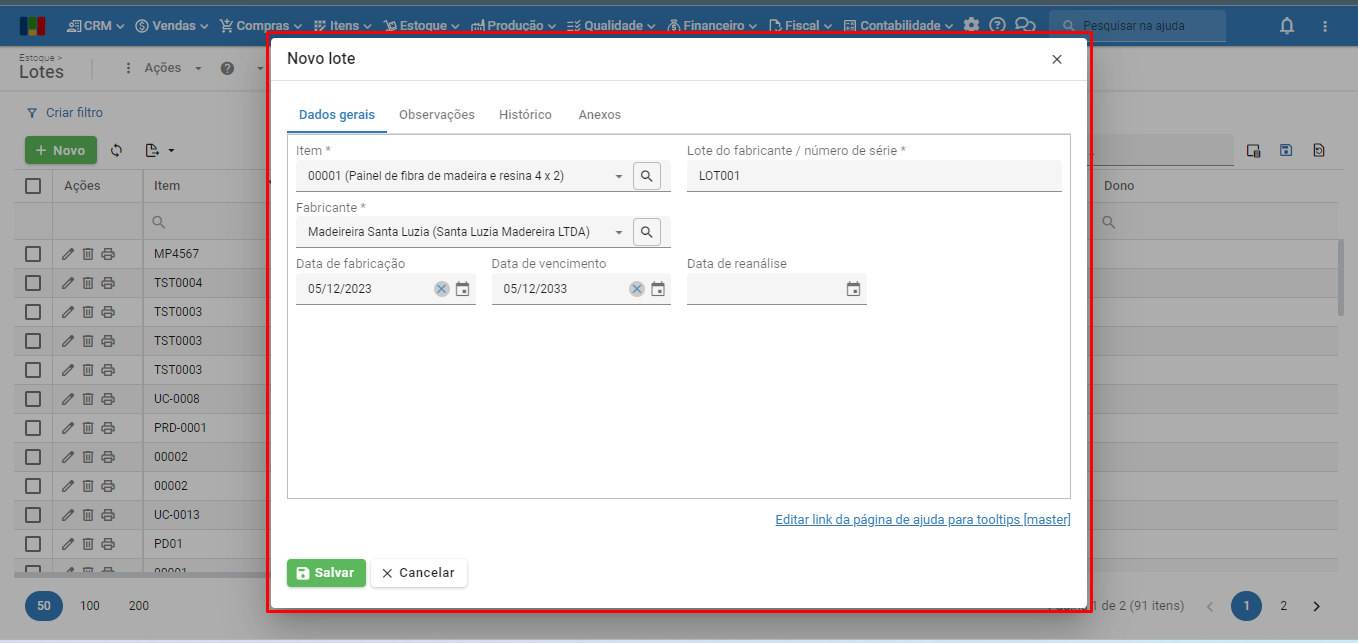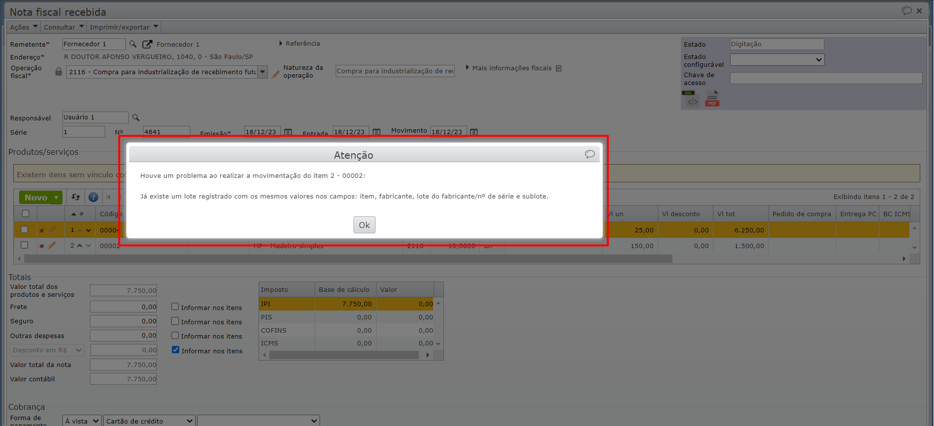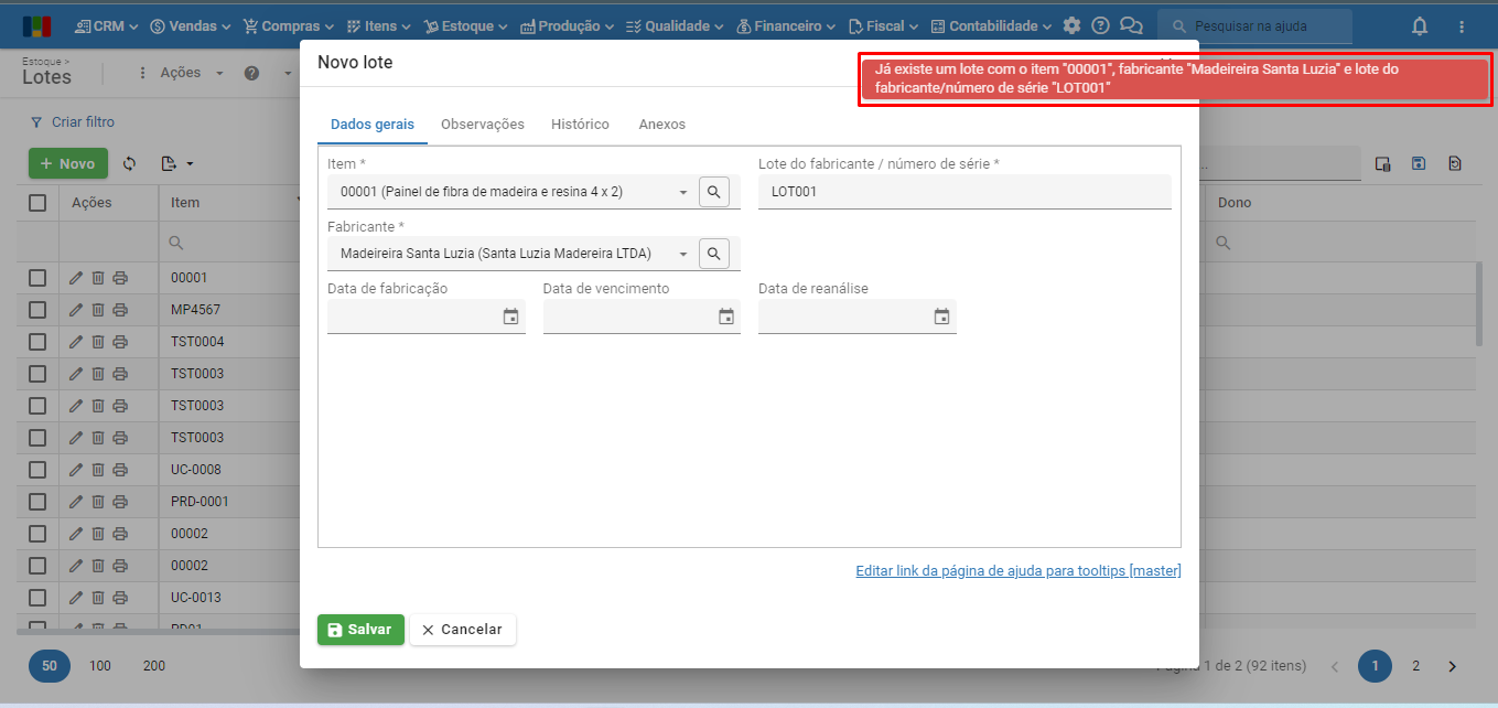 b) Depois, tentou cadastrar outro lote com as mesmas informações, e o sistema retornou uma mensagem de “Atenção“, com um botão “Ok“: “Já existe um lote com o item “00001”, fabricante “Madeireira Santa Luzia” e lote do fabricante/número de série “LOT001”.
