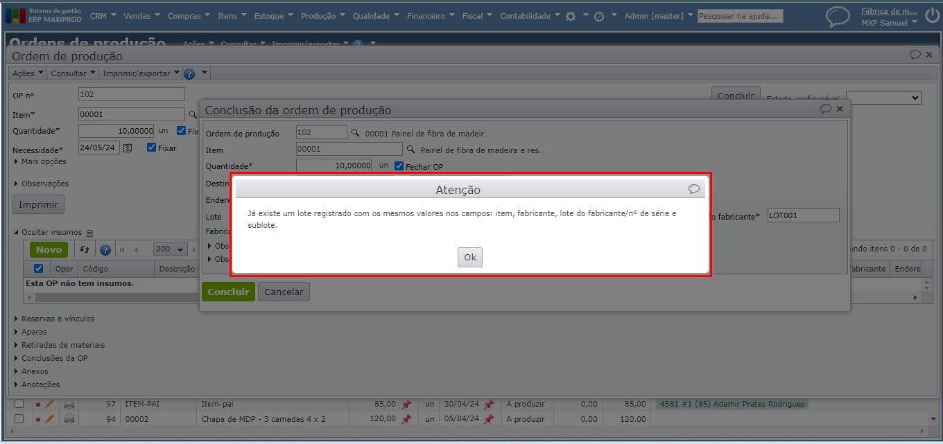 c) Esta mensagem também é exibida ao tentar concluir uma OP, cujo produto corresponde a lotes já cadastrados.