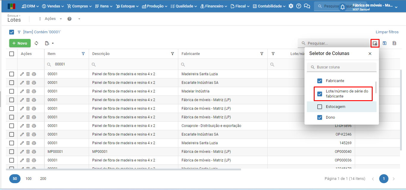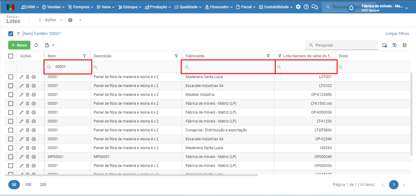 2) Na tela de lotes, preencha os filtros das colunas que referenciam o lote, tais como “Item“, “Fabricante” e “Lote/número de série do fabricante“.