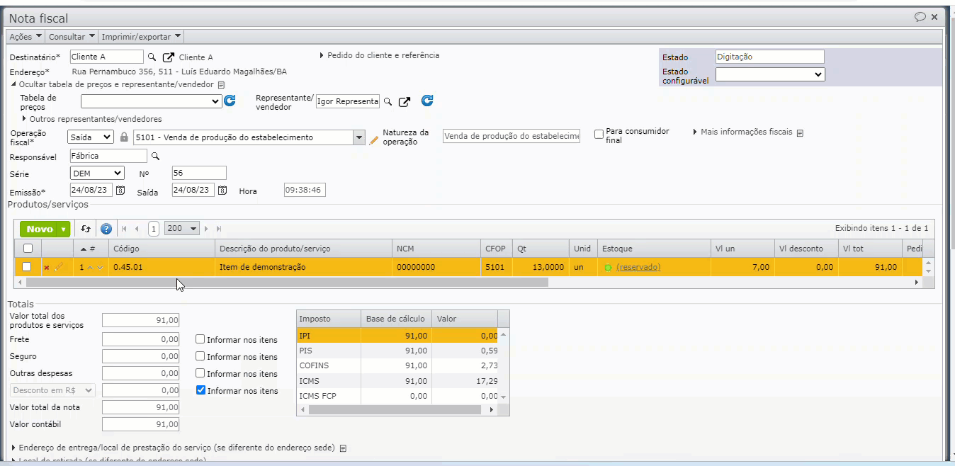 a) O usuário emite a NF-e nº 56 no dia 24/08 com 13 un do item 0.45.01, mas não movimenta estoque.