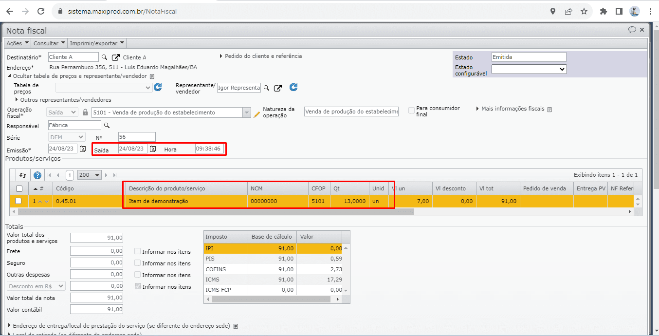 c) Retorna à NF-e nº 56 e desfaz a emissão, mantendo a data de “Saída” 24/08 e marca a opção “Movimentar estoque”.