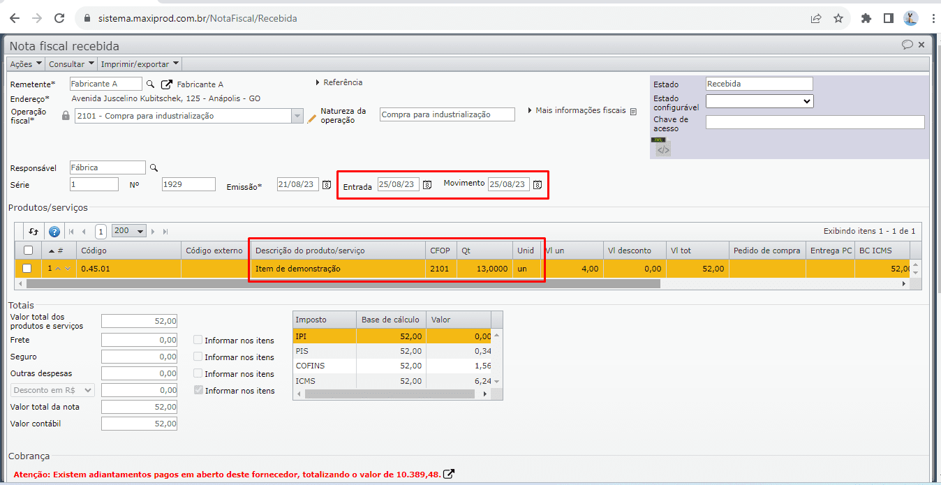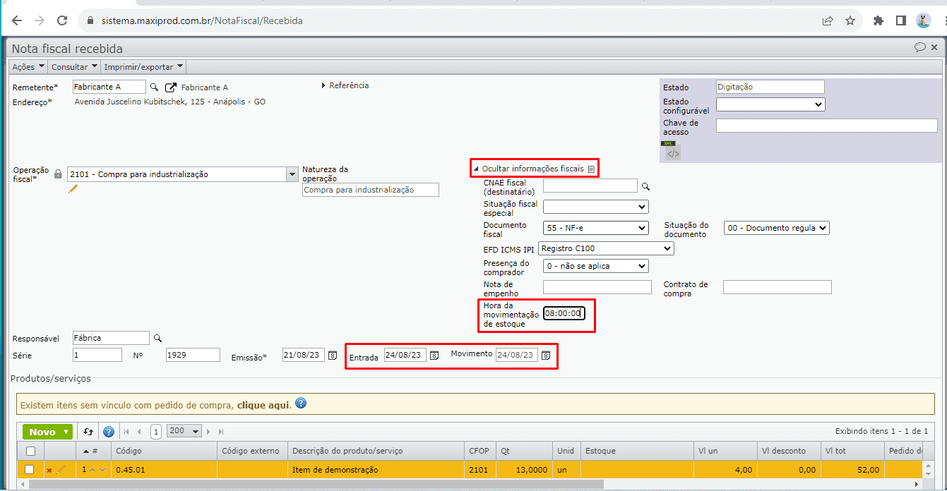 - Na linha seguinte, é mostrada a movimentação seguinte do item naquela conta de estoque, que foi o recebimento da NF n.º 1929 do “Fabricante A” com 13 unidades, mas esta movimentação ocorreu em 25/08/23. Ou seja, depois que a NF-e nº 56 tentou a movimentação de saída do item, quando ainda não havia estoque.