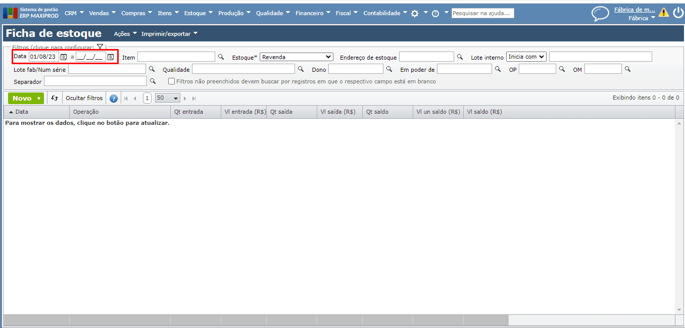 3) Na “Ficha de estoque” informe no filtro “Data” o intervalo de datas que deseja ver na tela. Este filtro é inicializado com o primeiro dia do mês atual.