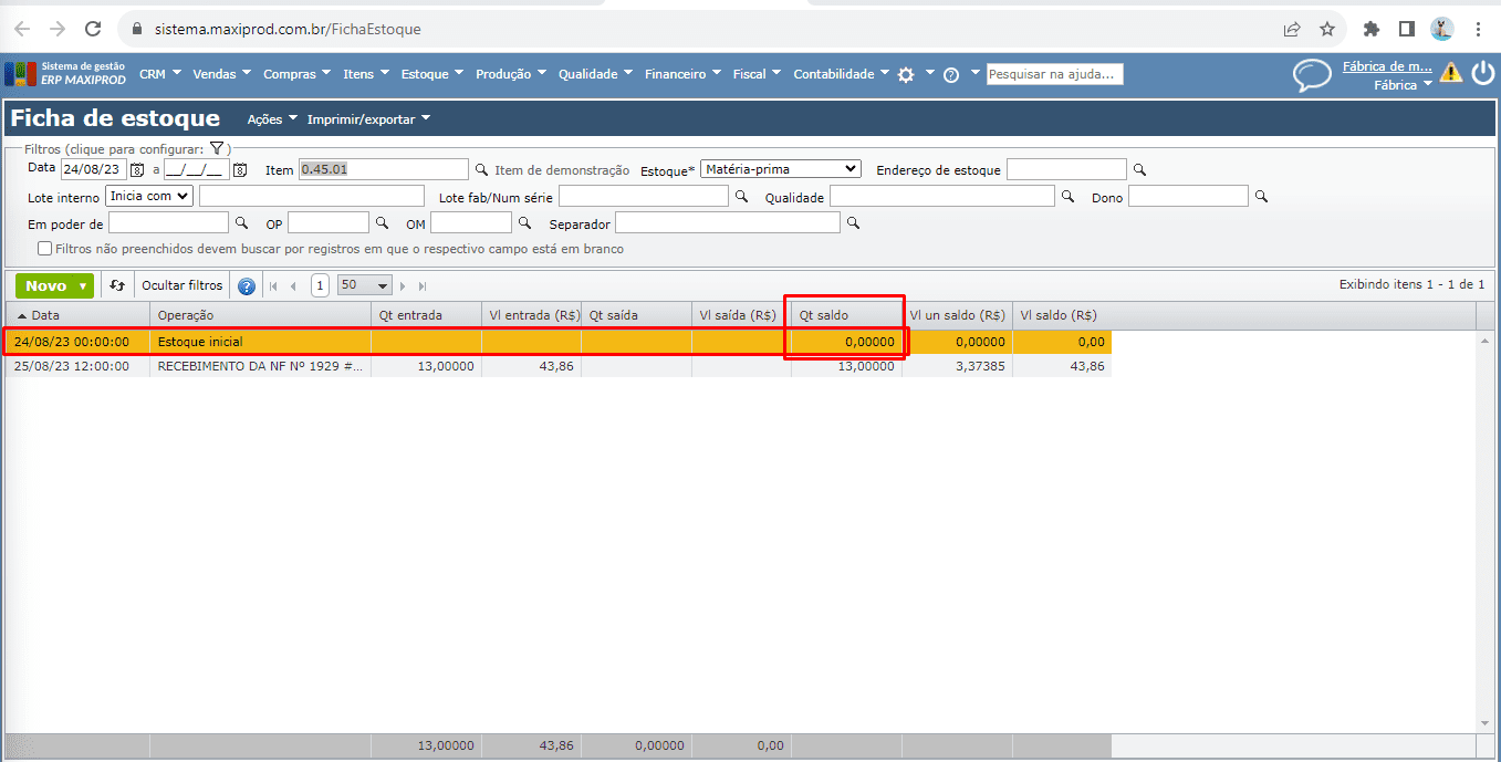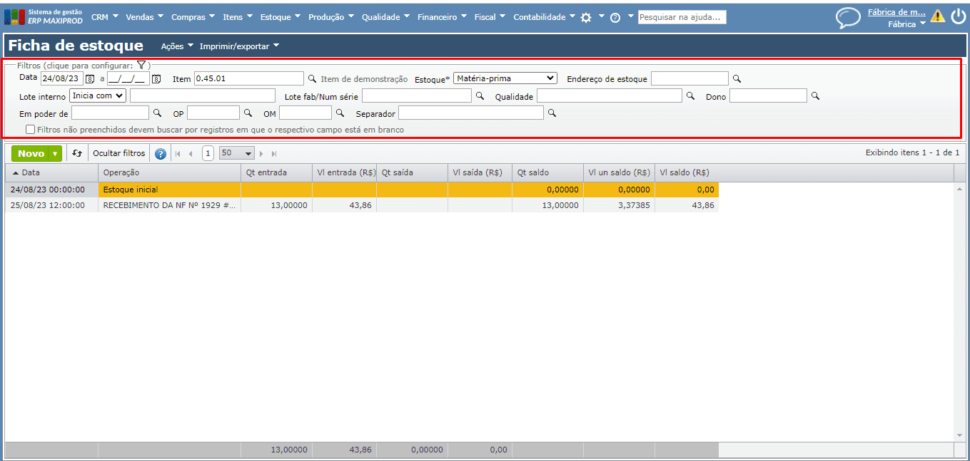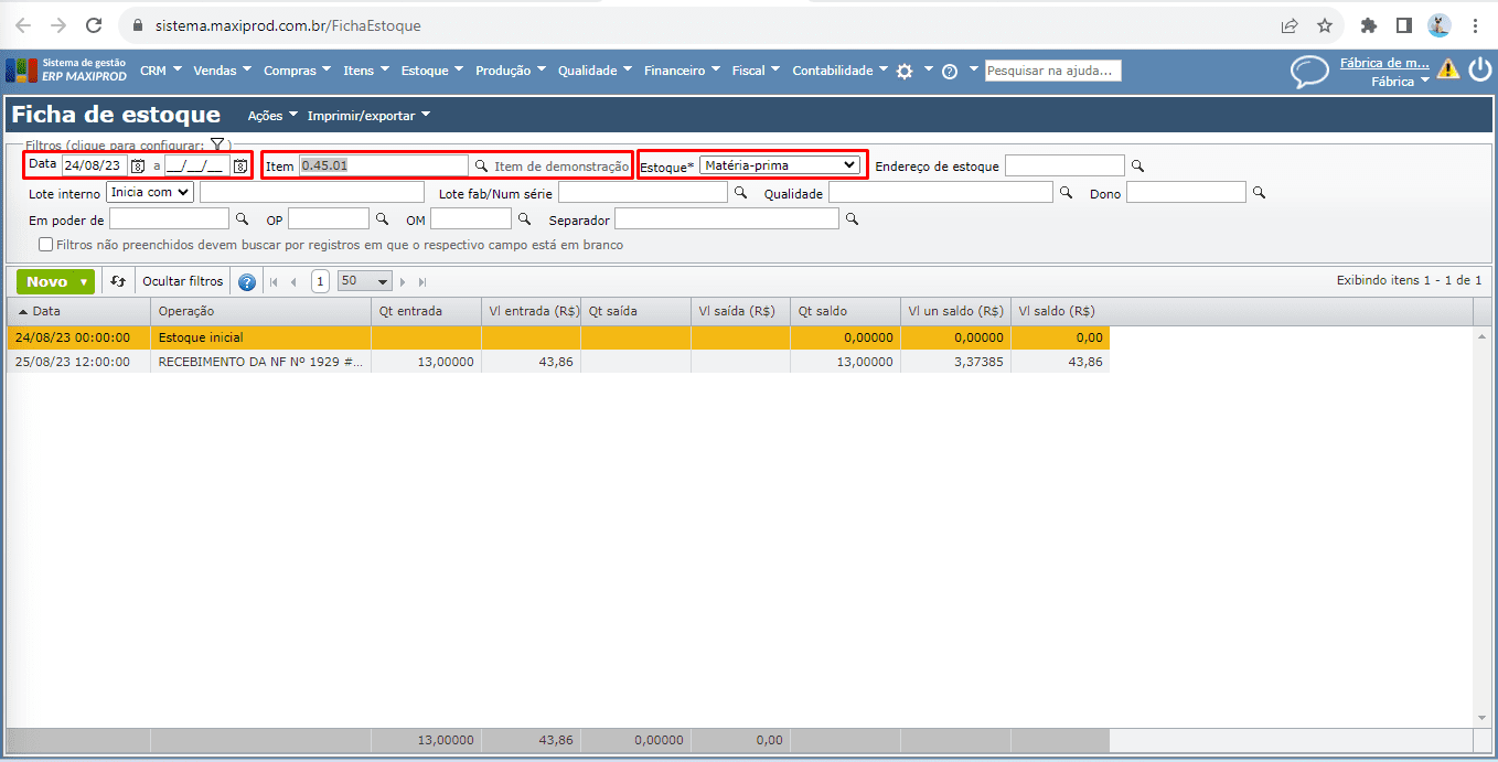 b) No dia seguinte, 25/08, recebe 13 un desse item através da NF nº 1929. Esta movimentação também poderia resultar de conclusão de OP, ou de entrada manual.