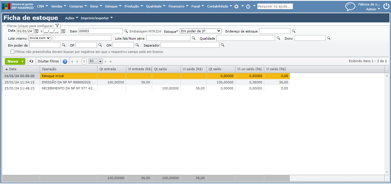 3) Estas telas mostram as movimentações de estoque de um item em um intervalo de datas. Enquanto a tela de movimentações de estoque exibe apenas as movimentações, a ficha de estoque exibe também a posição do estoque após cada uma destas movimentações. Para saber mais sobre ficha de estoque, clique aqui.
