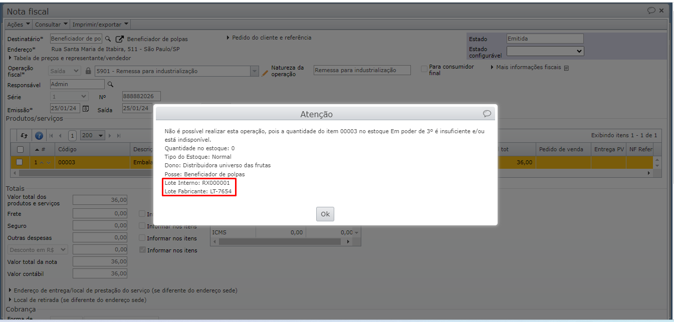 - Se qualquer propriedade deste registro de estoque for alterada, mediante saída manual, inspeção, mudança de endereço de estoque, alteração do dono e/ou posse, etc., sem que seja por meio da NF de origem, a quantidade no registro de estoque pode se tornar insuficiente para desfazer a emissão da NF.