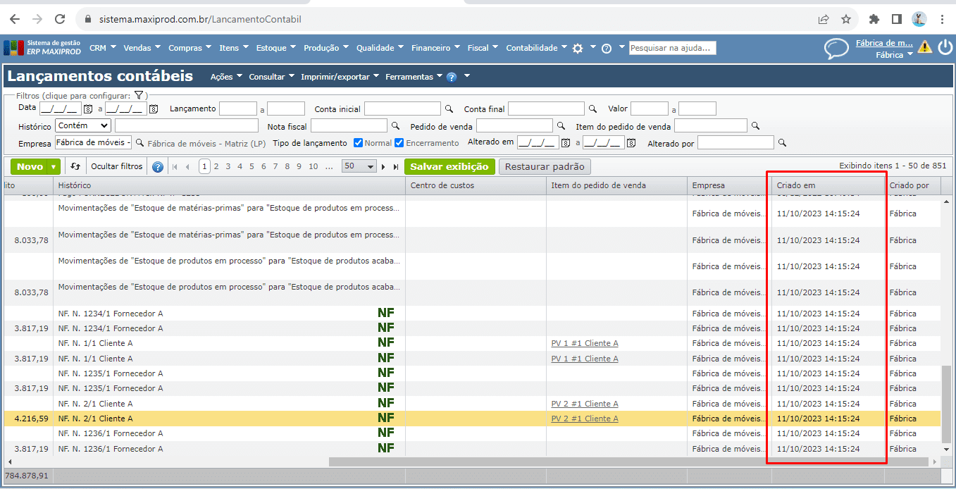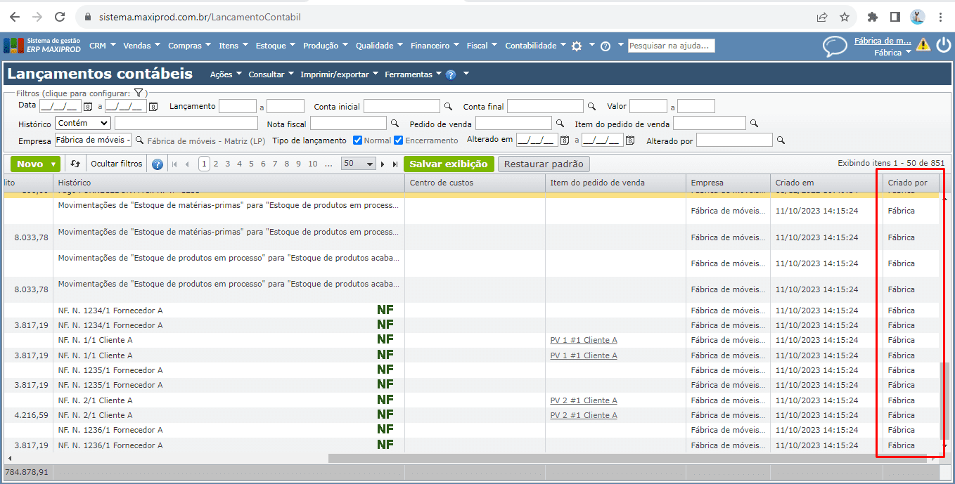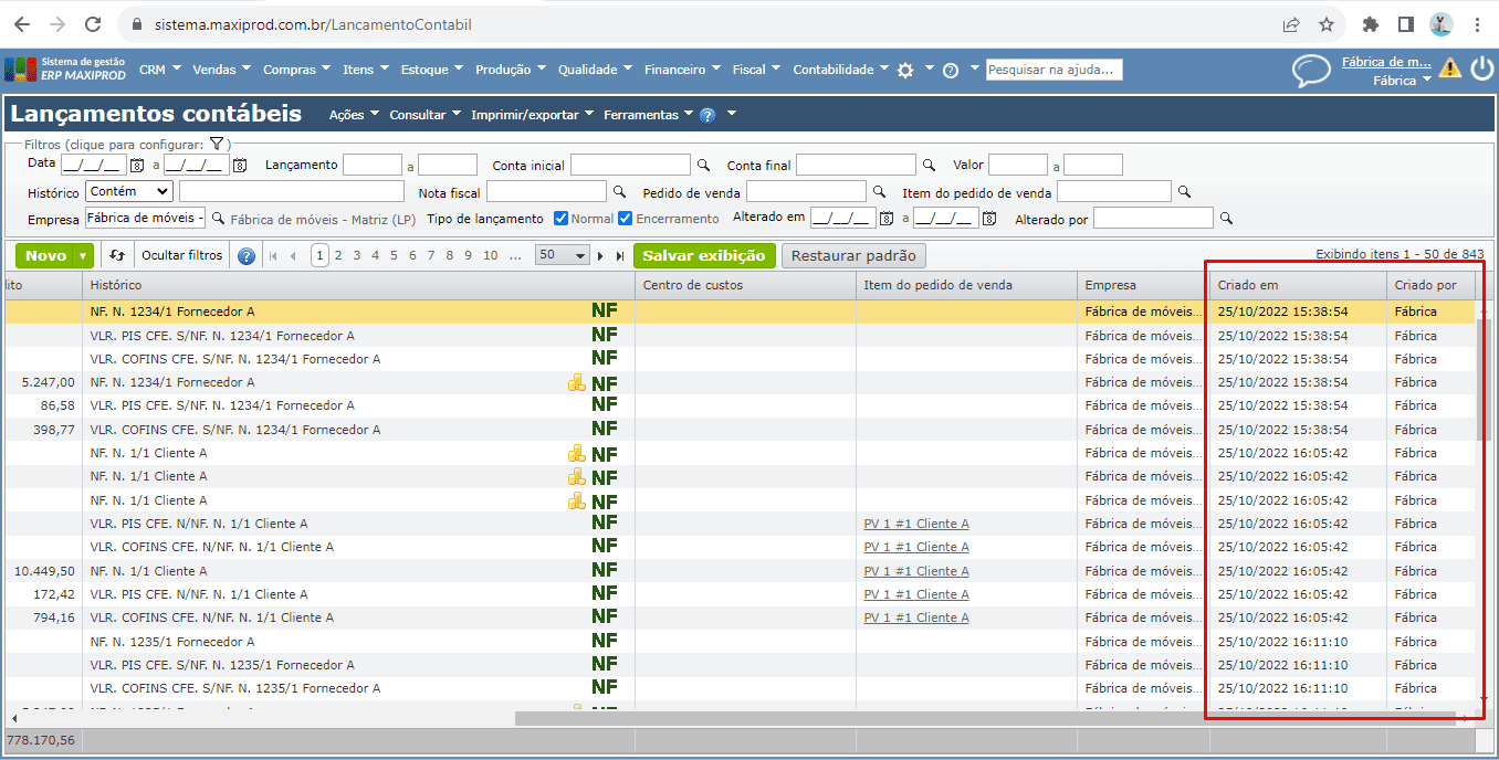 A coluna “Criado por” nas telas do ERP MAXIPROD exibe o apelido do usuário criador do respectivo registro, enquanto a coluna “Criado em” exibe a data em que o registro foi criado no sistema. Estas colunas existem nas telas de movimentações de estoque (que pode ser acessada através do menu “Estoque” > opção “Movimentações de estoque” ou a partir de registros que geraram as movimentações, como as NFs). Existem também nas telas de lançamentos contábeis (que pode ser acessada através do menu “Contabilidade” > opção “Lançamentos contábeis” ou a partir de registros que geraram lançamentos contábeis, como as NFs). Estas colunas nestas telas são inicializadas ocultas, por padrão.