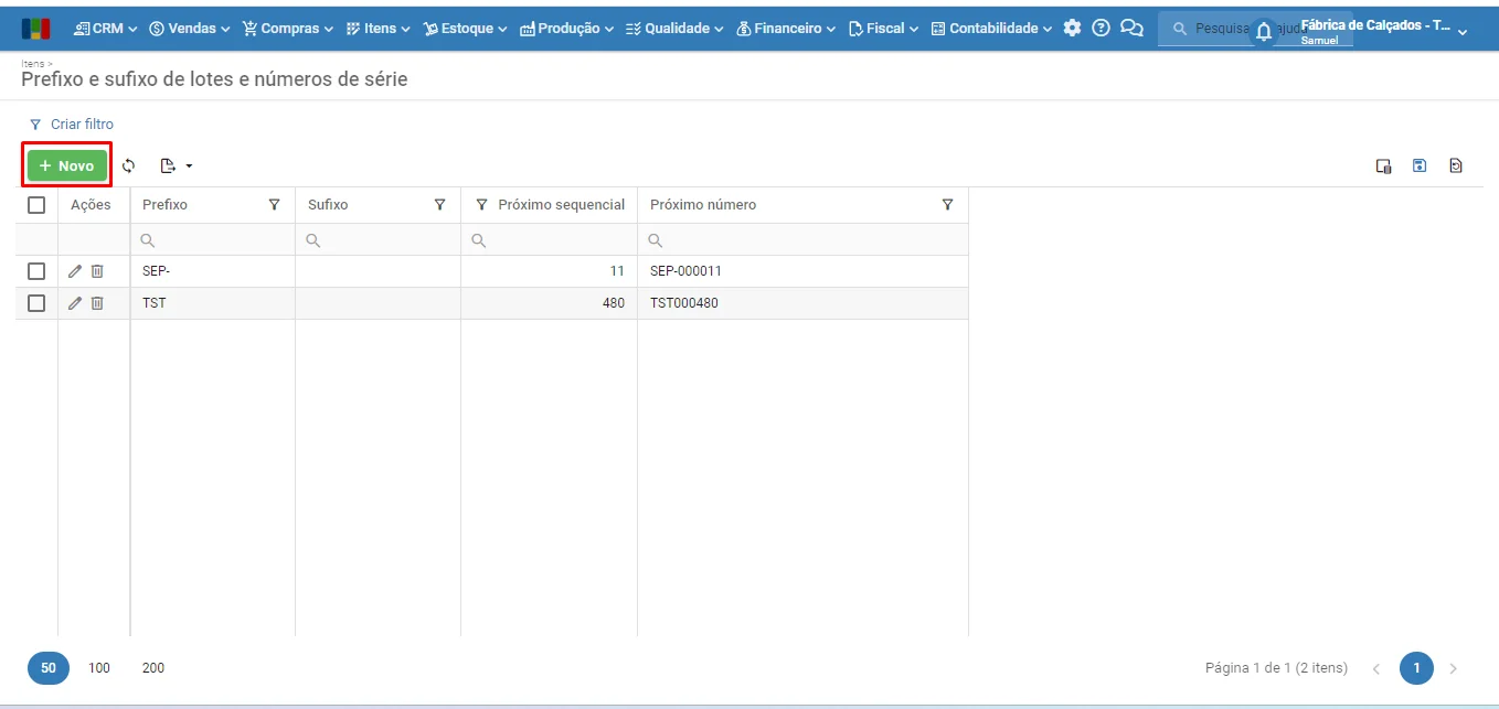 1) Para criar um novo prefixo, vá ao menu “Itens” > “Cadastros” > “Prefixos de número de série”.