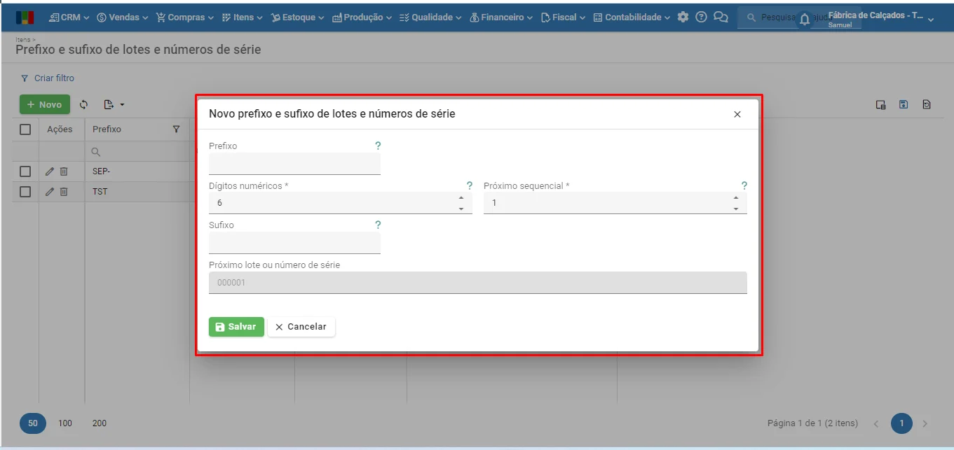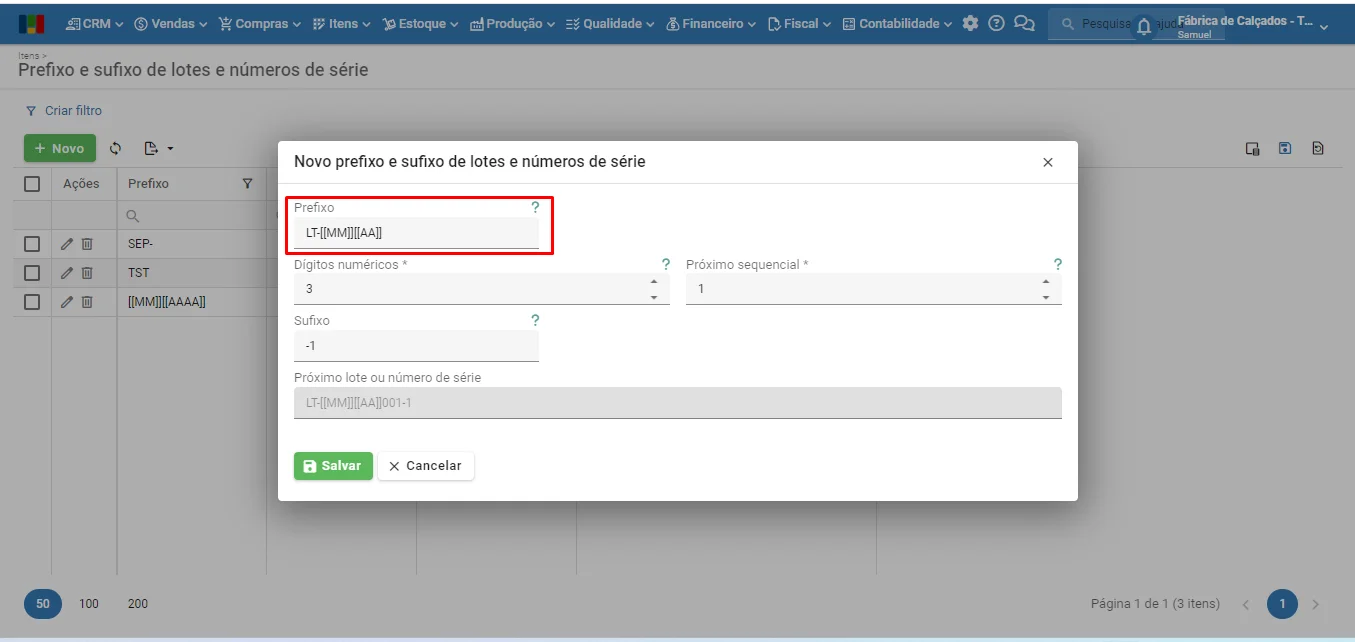 - Prefixo: valor inicial fixo dos lotes e números de série a serem criados.