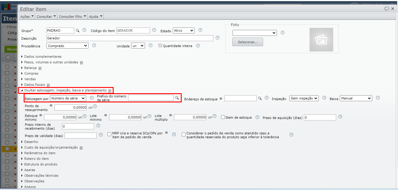 Na janela de edição do item, ao selecionar a forma de estocagem “Número de série”, o campo “Prefixo do número de série” deve ser preenchido com um prefixo previamente cadastrado na tabela de prefixos de números de série.