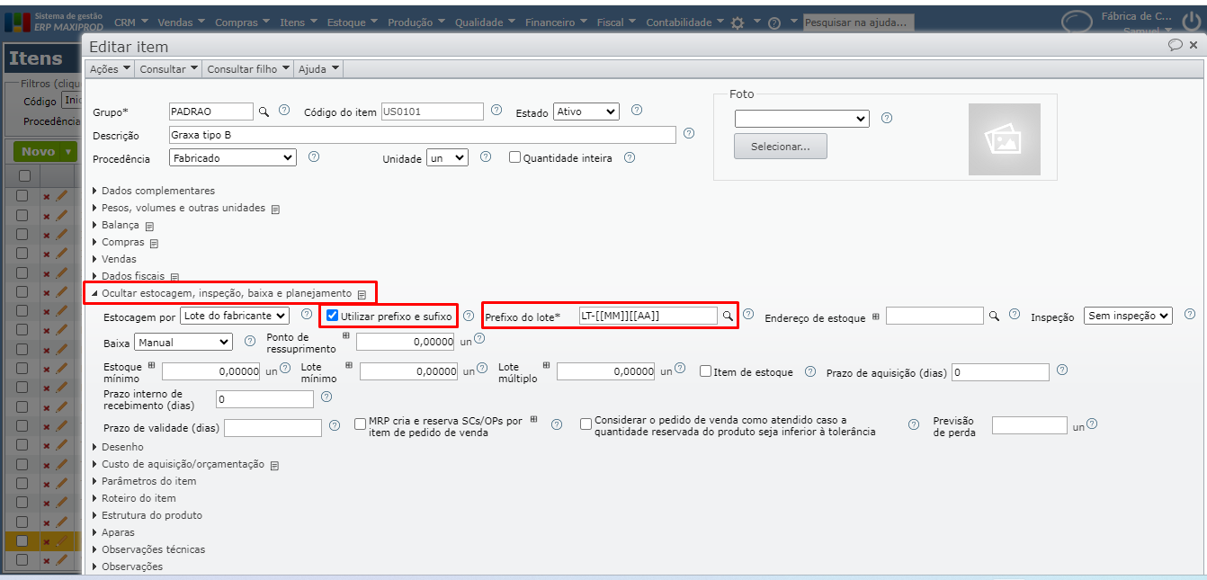 6) Se a estocagem for por “Lote do fabricante”, a direita será exibido o parâmetro “Utilizar prefixo e sufixo”, que se marcado, permite a seleção do prefixo e sufixo do lote.