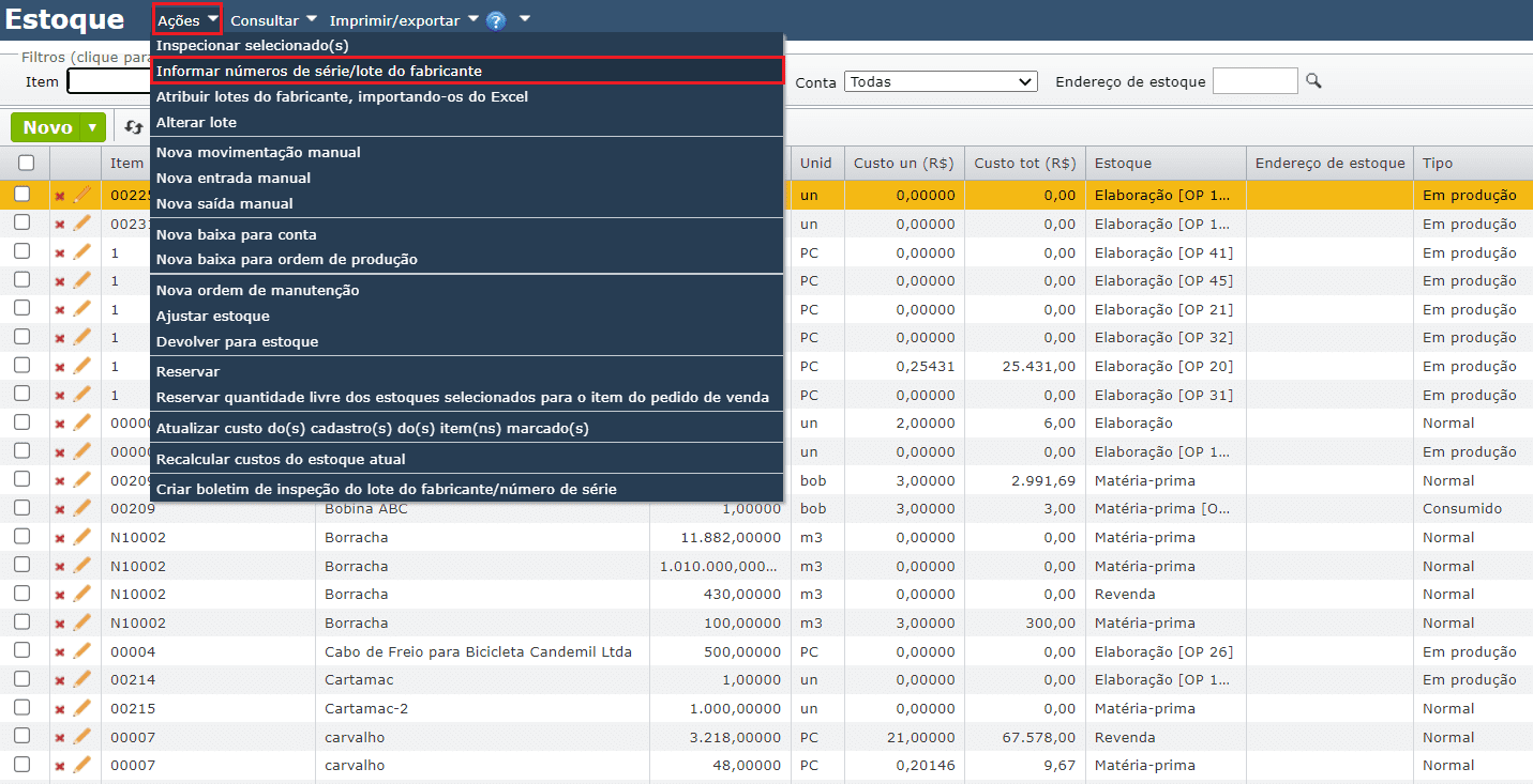 1) Para atribuir números de série a itens do estoque, vá no menu “Ações > Informar números de série/lote do fabricante”: