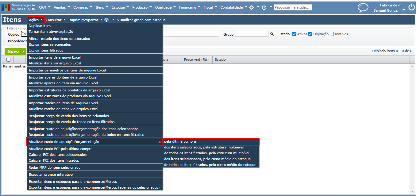 1) Para atualizar o custo de um produto a partir da última compra, abra a grade de itens, e clique no menu “Ações” > “Atualizar custo de aquisição/orçamentação” > “pela última compra”.