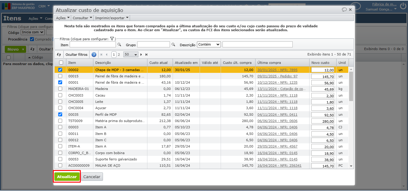 2) Selecione os produtos cujo custo deseja atualizar e clique em “Atualizar”.