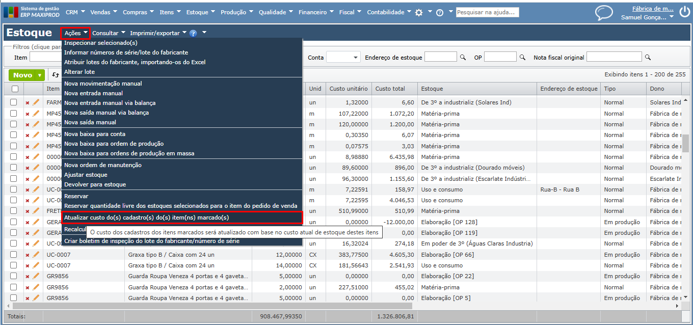 3) Para atualizar o custo orçado do item a partir do seu custo de estoque, clique no menu superior “Estoque” > “Estoque”. Na tela de estoque, marque a caixa de seleção dos itens cujo custo deseja atualizar, e clique no menu “Ações” > “Atualizar custo do(s) cadastro(s) do(s) item(ns) marcado(s)”.