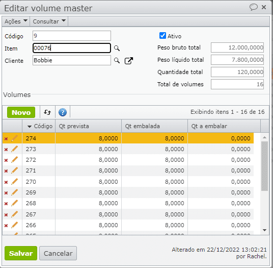 - Quantidade embalada: exibe a quantidade total de unidades de itens embaladas dentro do volume.