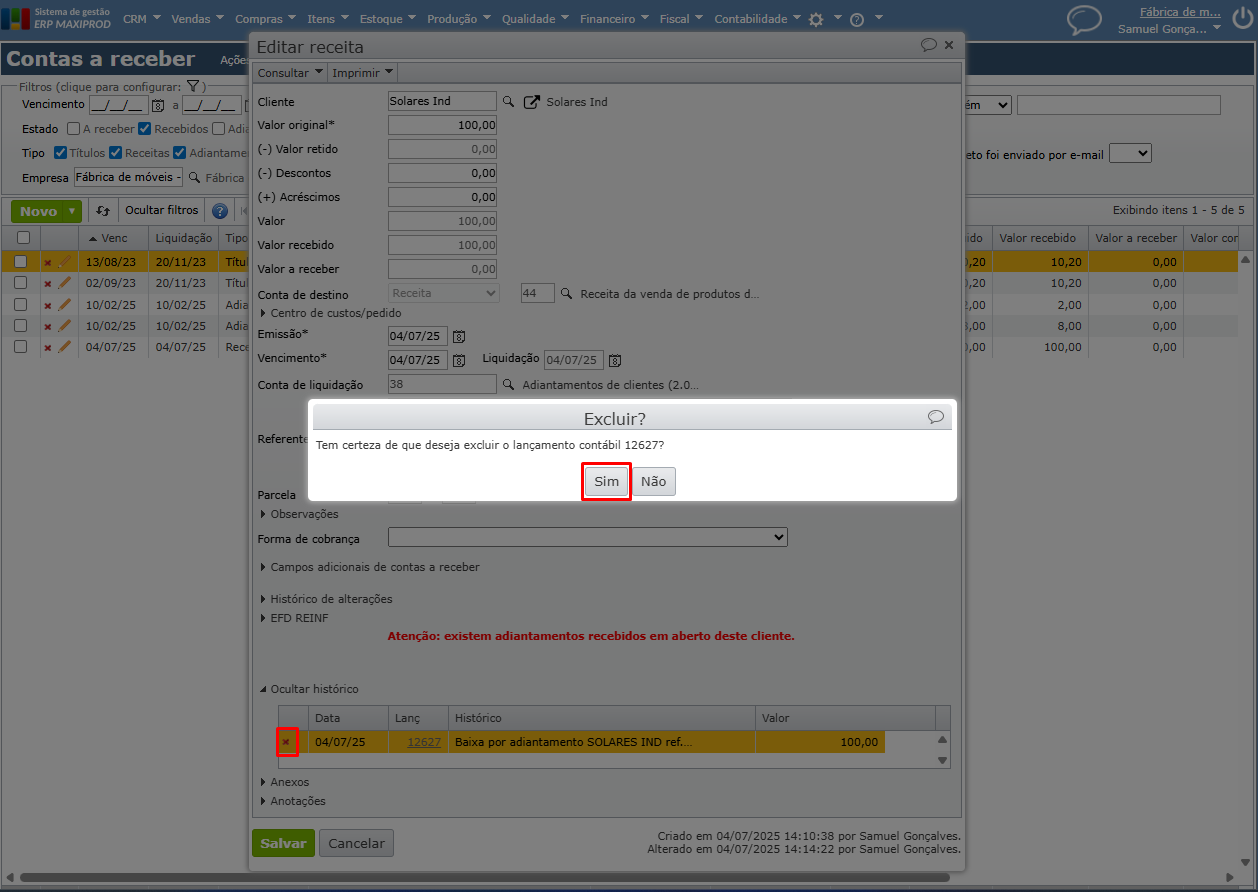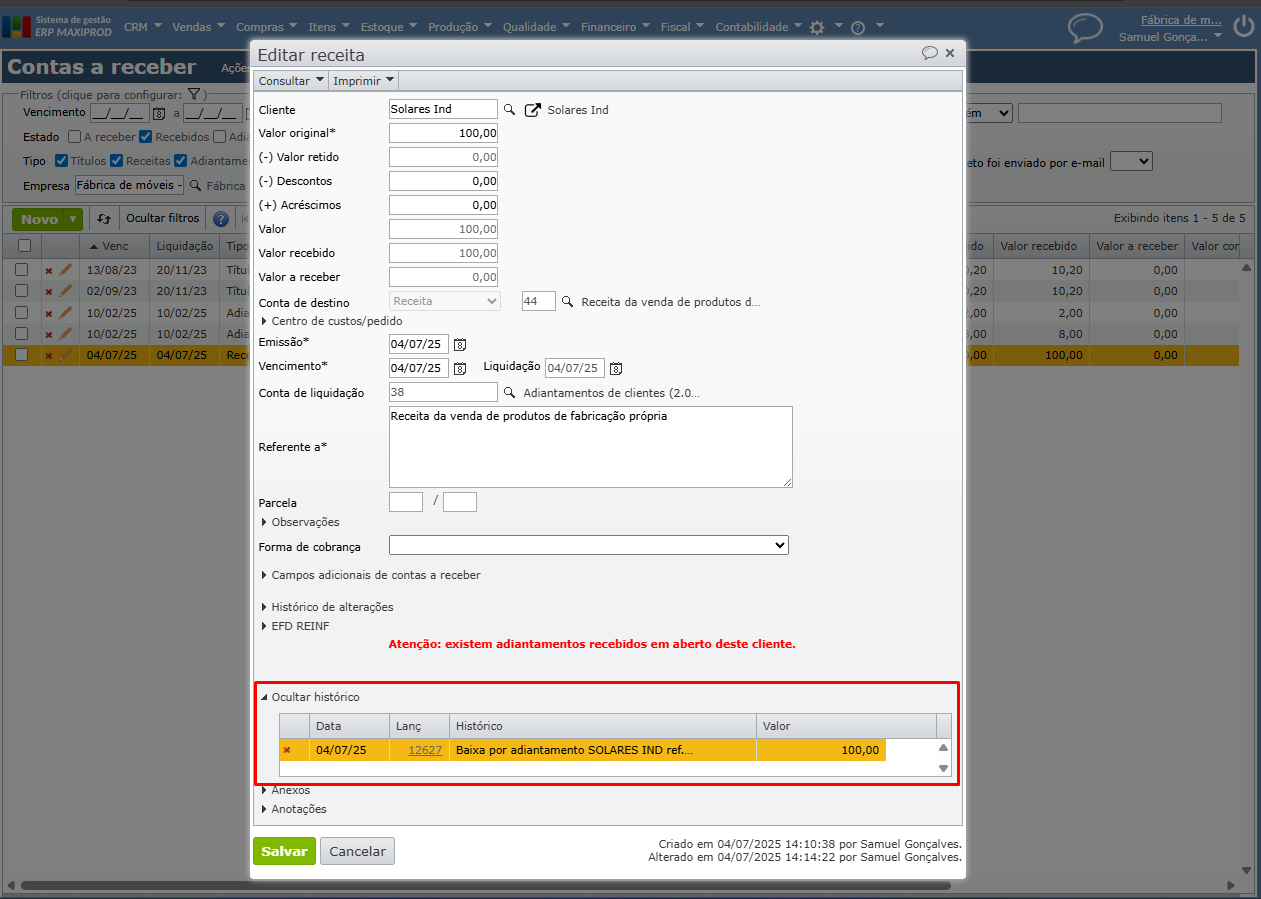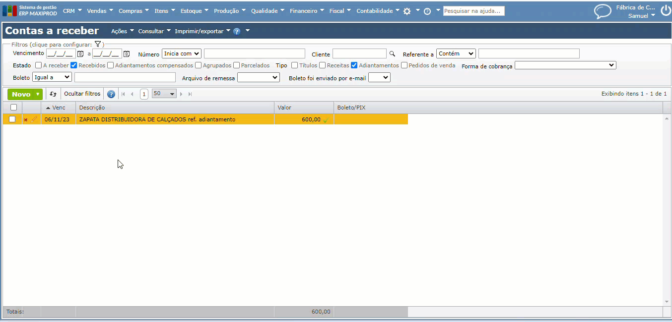 4) Será gerado automaticamente o adiantamento nas contas a receber, já vinculado a esse pedido.