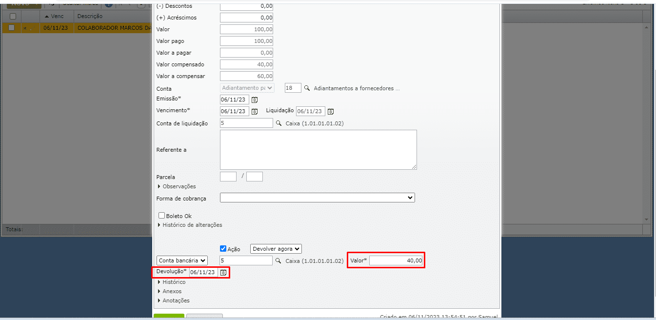 3) Nos campos “Valor” e “Data” preencha o valor e a data do lançamento contábil de devolução.