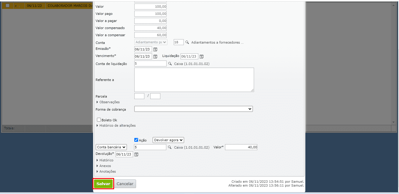 4) Clique no botão verde “Salvar” para efetivar a devolução.