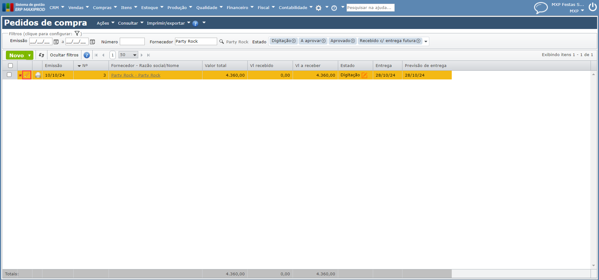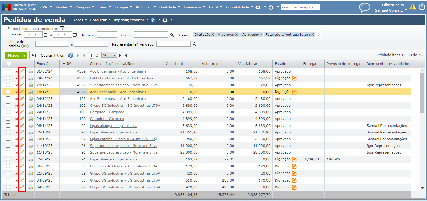 1) Acesse a tela de pedidos, seja de venda ou compra, e abra a tela de edição, clicando no ícone do lápis.
