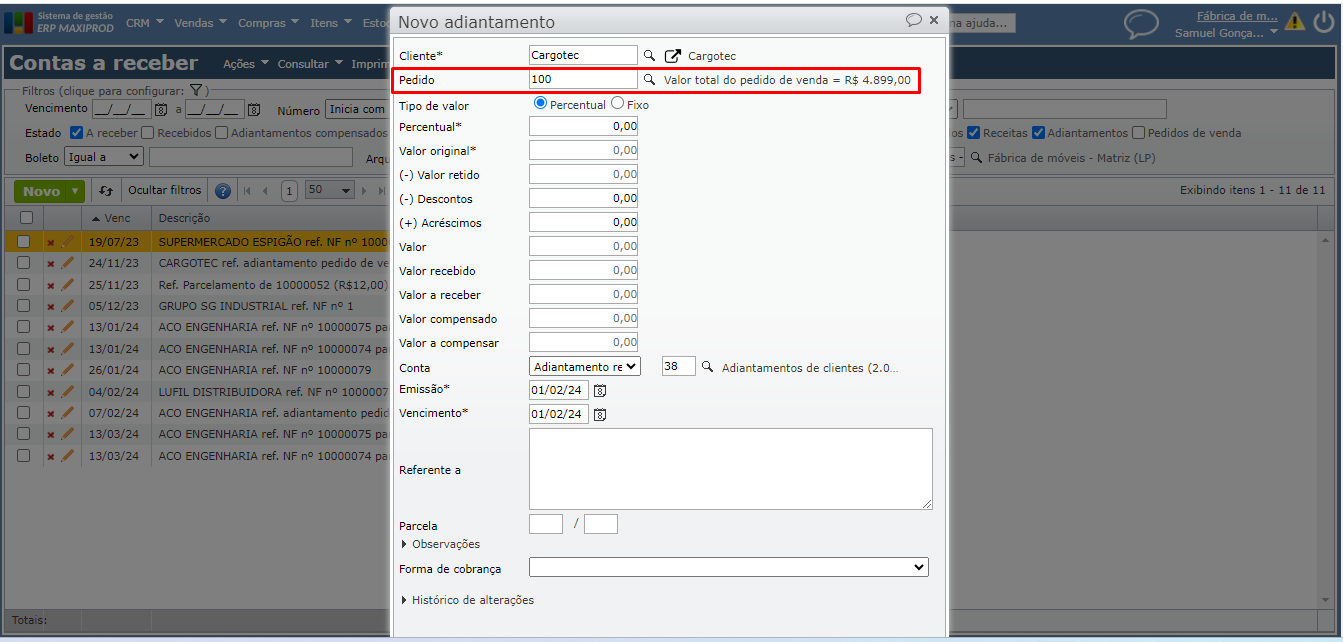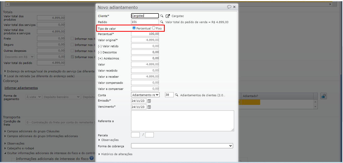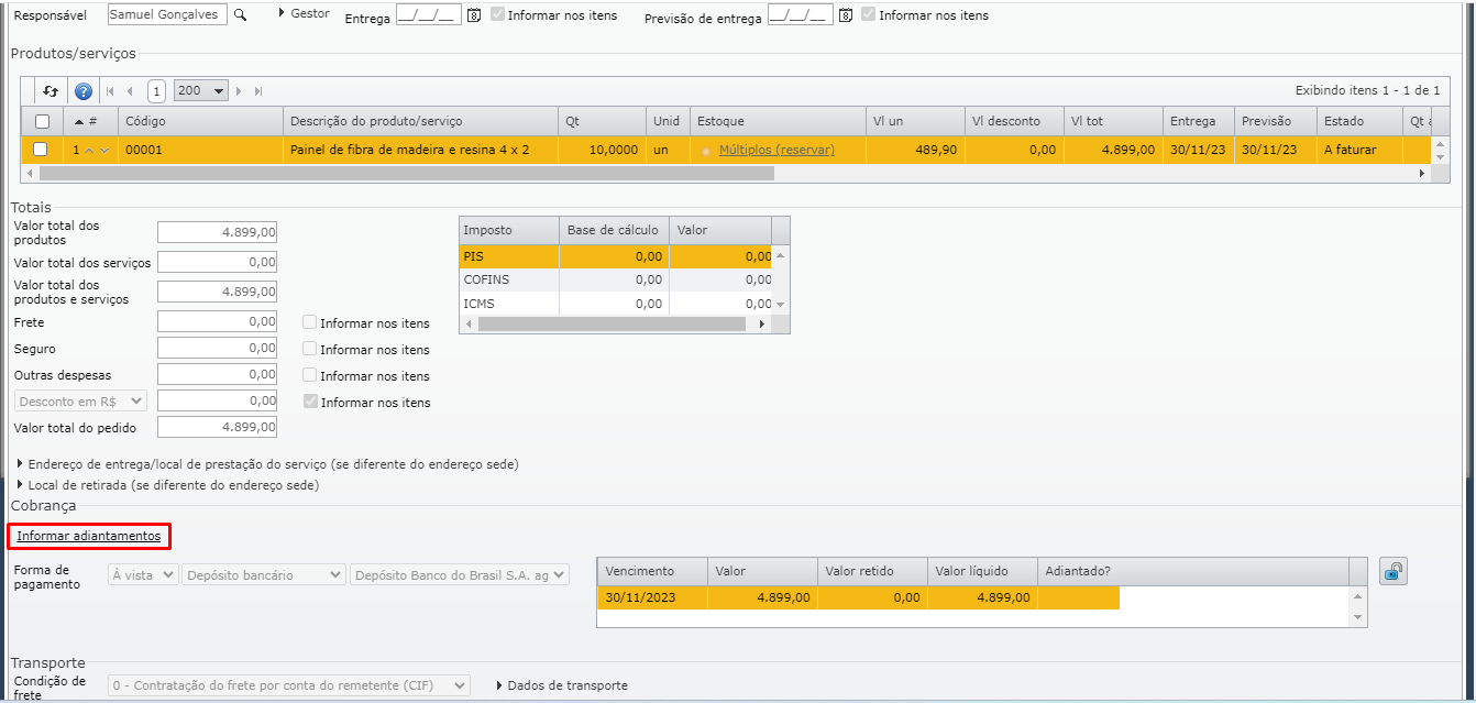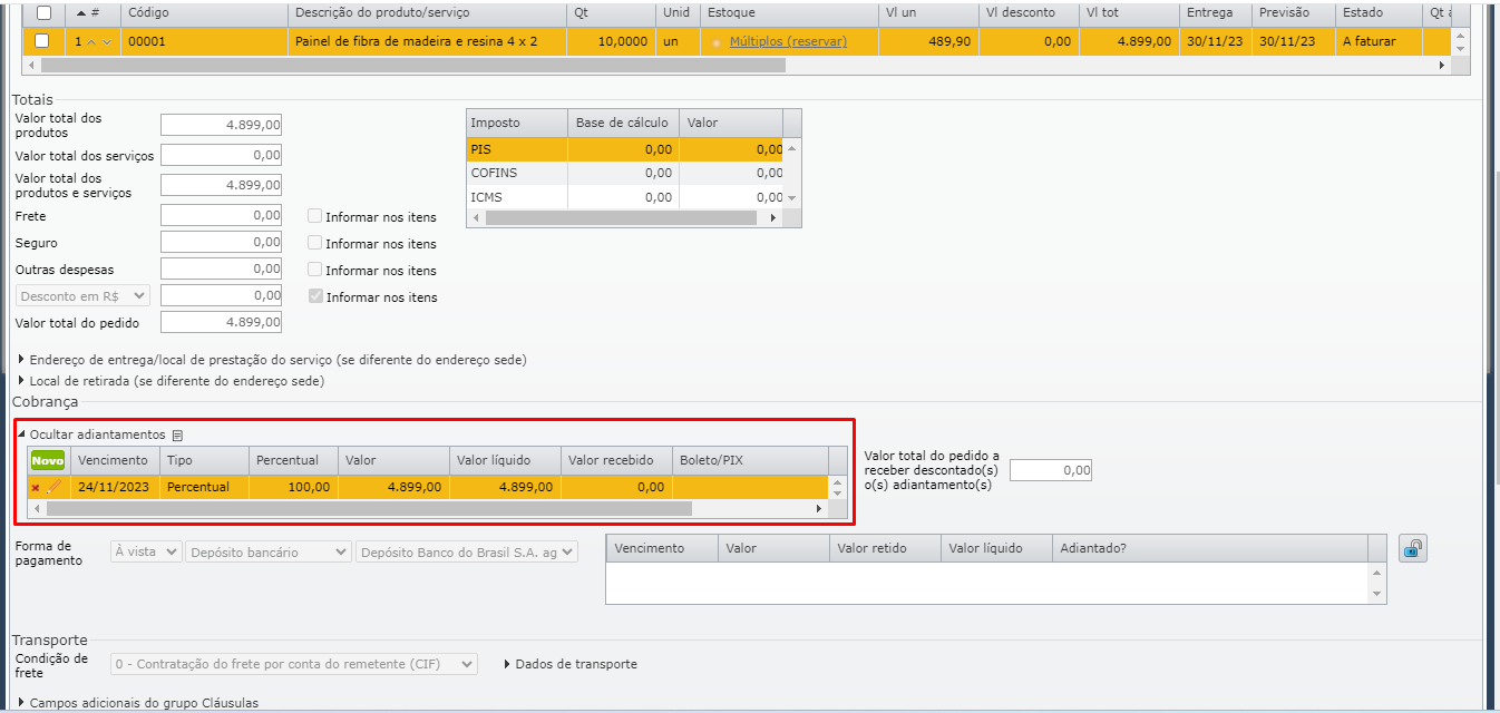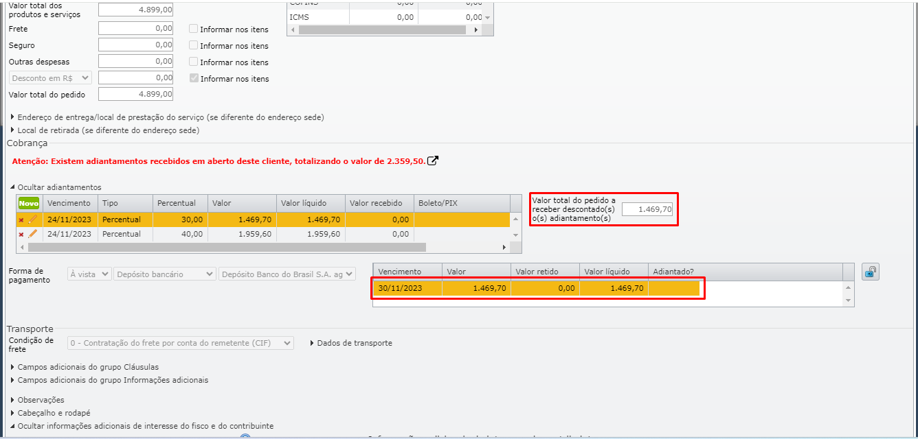 1) Após informar adiantamentos em um pedido, seguindo os passos acima, os títulos do pedido são calculados descontando os adiantamentos.