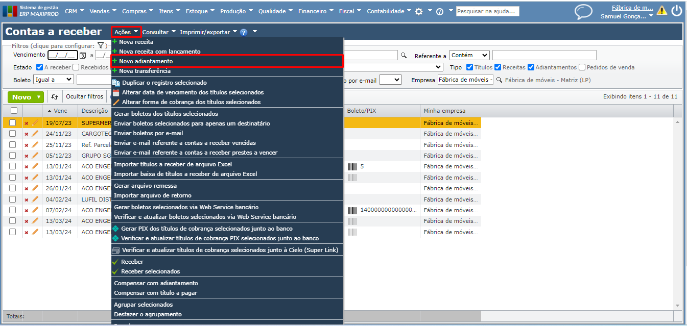 3) Acesse a tela de contas a receber ou a pagar, e clique no menu “Ações > Novo adiantamento”.