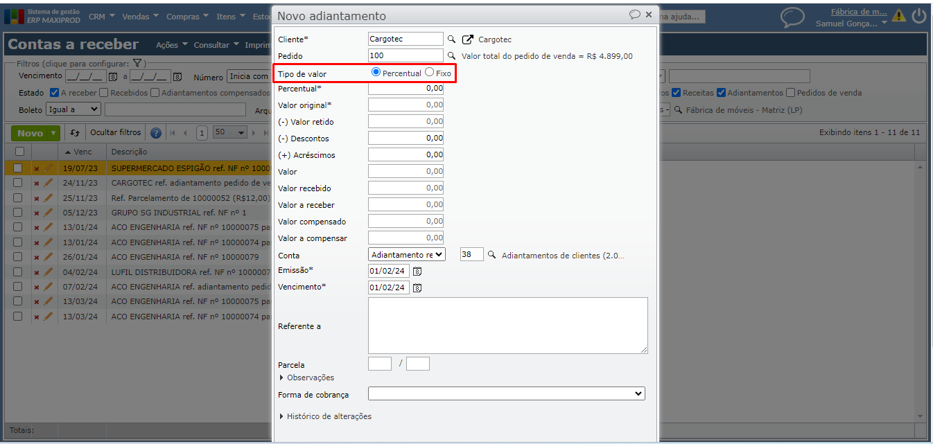 3) É aberta uma janela para preenchimento dos dados do novo adiantamento. Escolha o tipo de valor “Percentual” ou “Fixo”, verifique os demais campos e clique no botão verde “Salvar” no rodapé da janela do novo adiantamento.