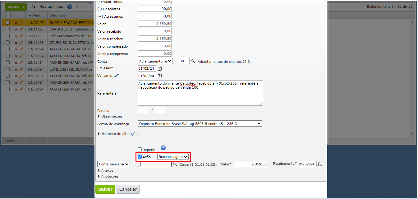 4) Preencha os dados necessários e clique em “Salvar”. Para efetivar o adiantamento, marque a caixa de seleção “Ação”, deixe a opção “Receber/pagar agora” selecionada, preencha os dados do recebimento/pagamento e clique em “Salvar”. No entanto, o adiantamento pode ser efetivado depois.