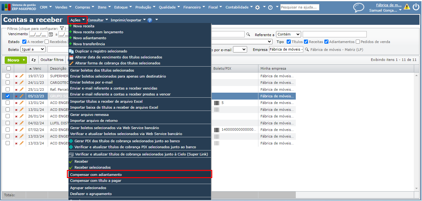 1) Para compensar o adiantamento, selecione o título a receber ou a pagar e acesse o menu “Ações > Compensar com adiantamento”.