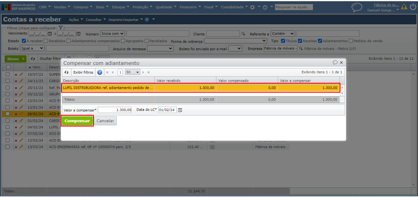 2) A nova janela exibe os adiantamentos recebidos deste cliente ou pagos ao fornecedor. Selecione o adiantamento referente a essa venda ou compra e clique em “Compensar”.
