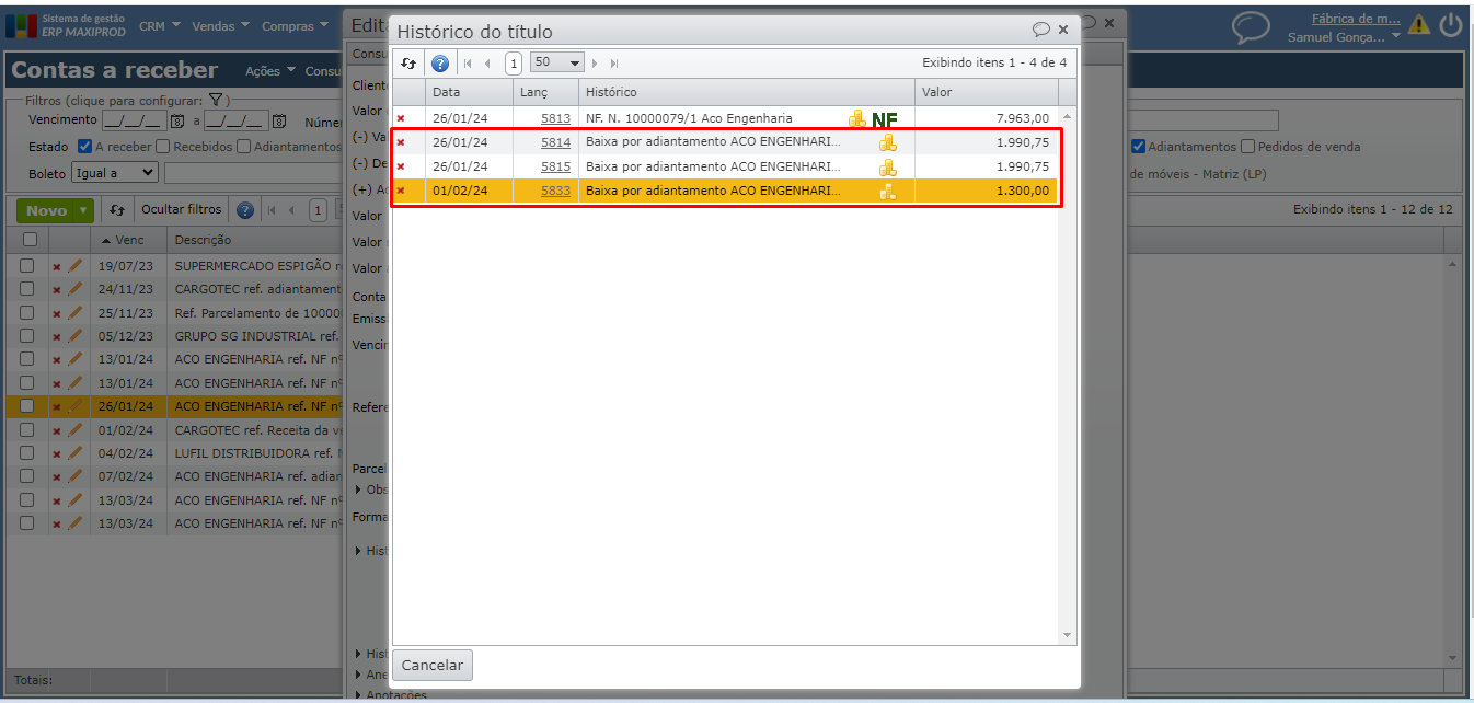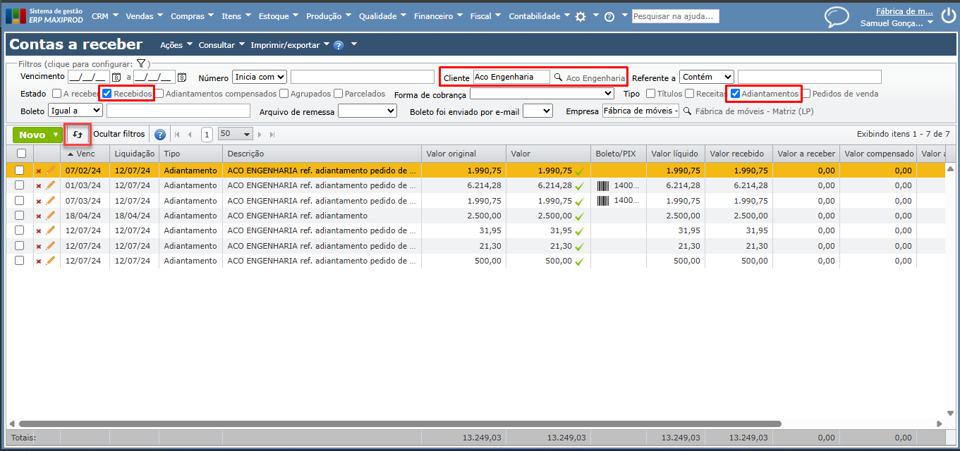 b) Ao clicar no ícone de redirecionamento é aberta a janela de contas a receber, filtrando pelo cliente, títulos no estado “Recebidos” e tipo “Adiantamentos”.